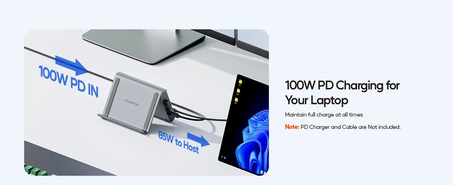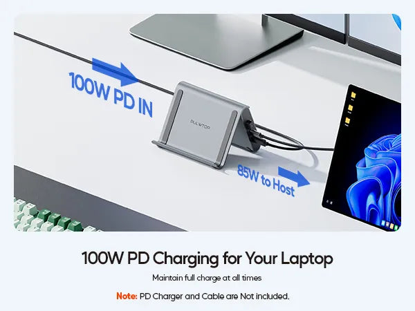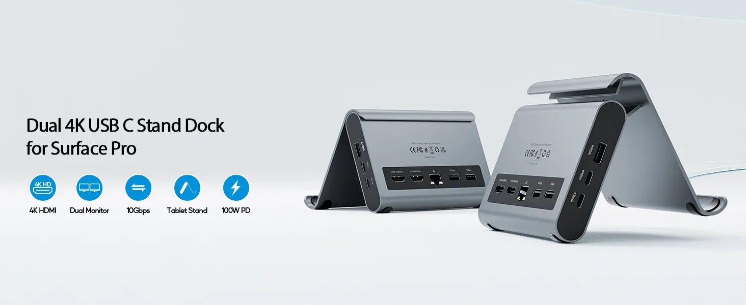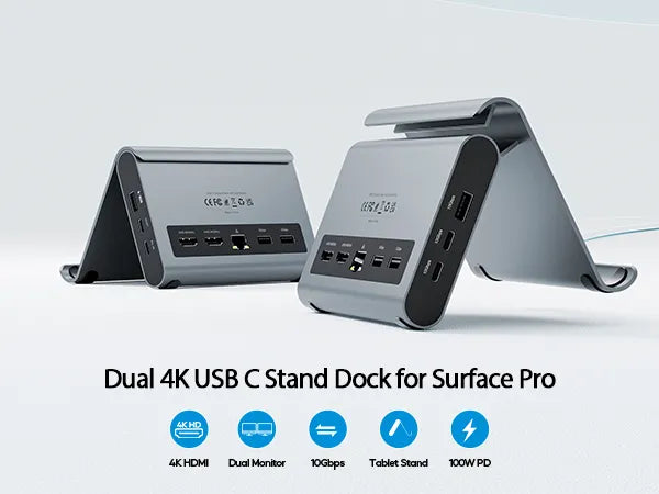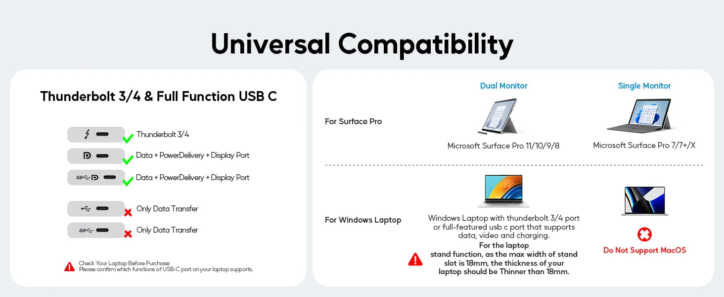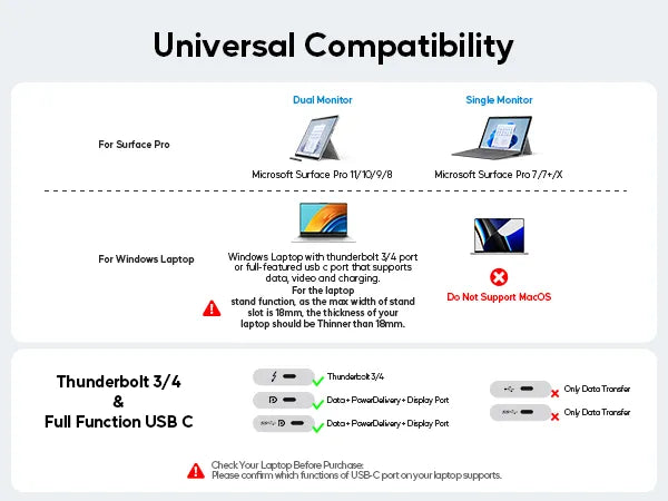 - 【Notice before buying】:The surface dock is compatible with Microsoft Surface Pro 11/10/9/8 (Dual Monitor) and Windows Laptop with thunderbolt 3/4 portor full-featured usb c port that supports data, video and charging ① The power adapter and power cord is not included; ② Please connect a power supply of at least 65W; ③ Mac OS only support one-monitor; ④ Surface Pro 7/7+/X only support one-monitor; ⑤ Due to the different thickness of Windows Laptops,some laptops do not support the stand function with laptop lid closed (Not Exceed 18mm).