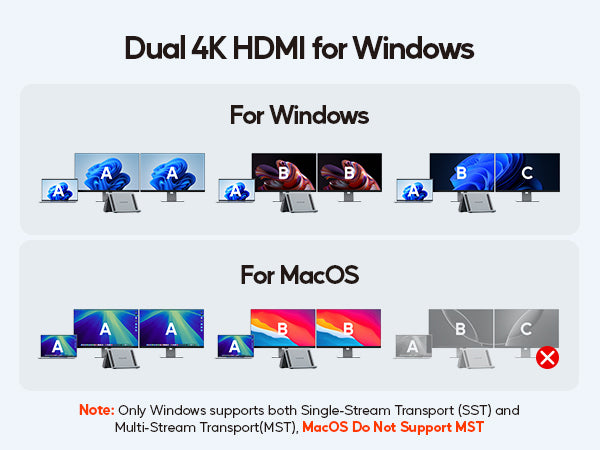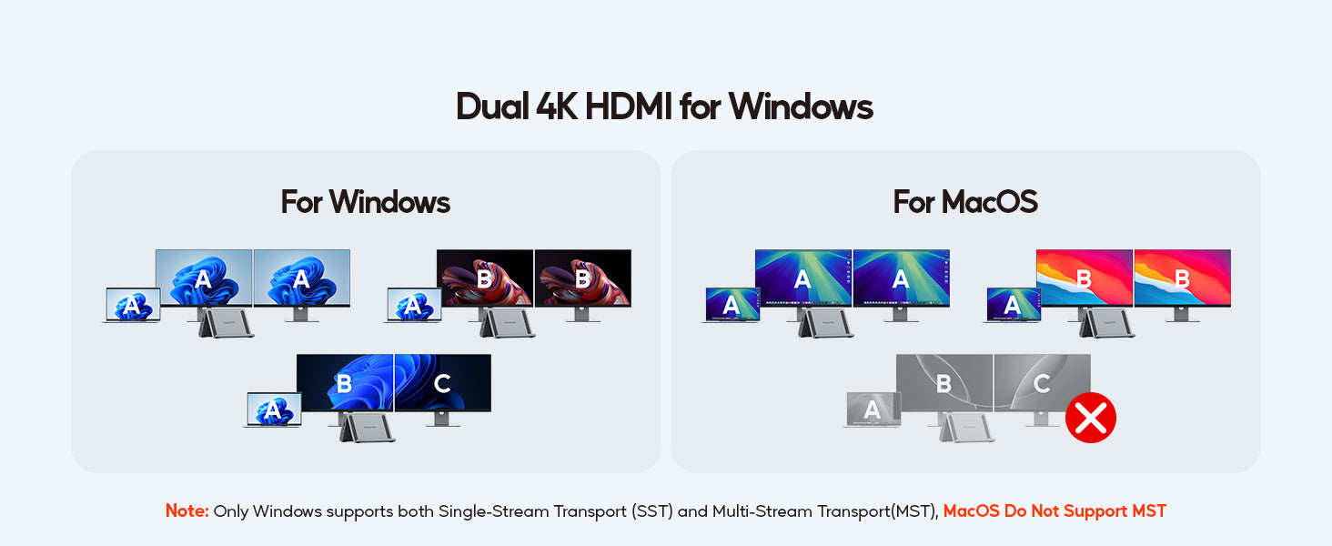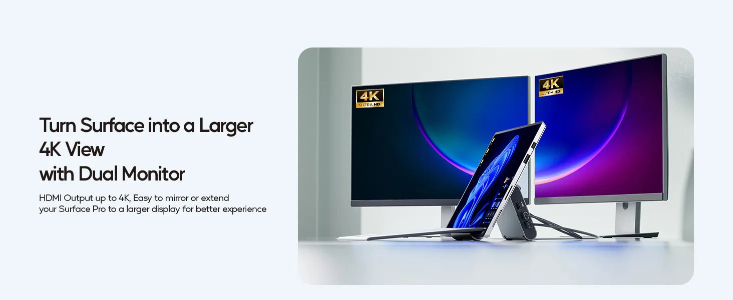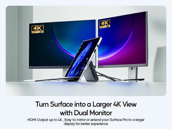 - 【4K HDMI HD Output】: The surface pro docking station dual monitor output up to 1*4K@60Hz or 2 *4K@30Hz, it can perfectly mirror or extend your screen to HDTV, monitor or projector, suitable for full HD movies, 3D video Games, office meetings and entertainment. Surf the web, watch video clips, transfer data, all in one. Bringing you vivid video synchronization.【NOTE】Due to the limitations of Mac OS, this docking station on Mac OS and iPad OS for dual-displays ONLY support Single-Stream Transport (SST: ABB/ AAA) mode.)