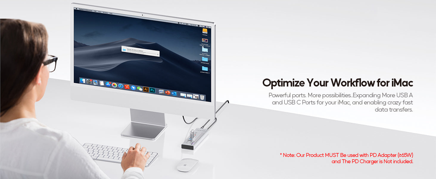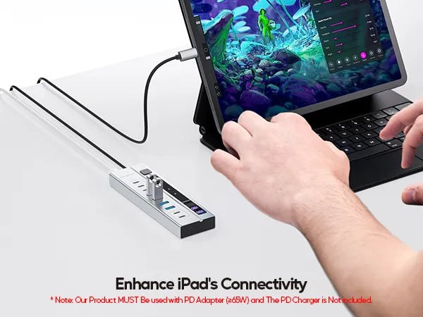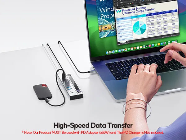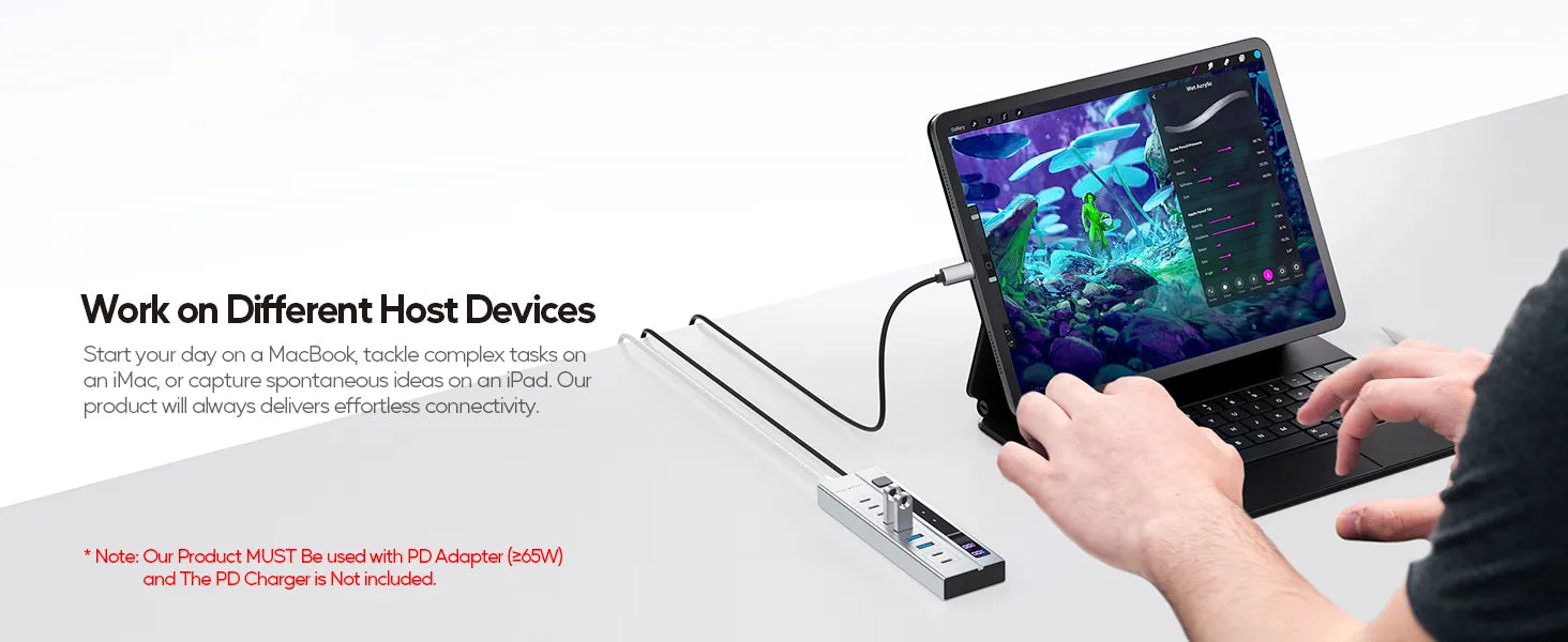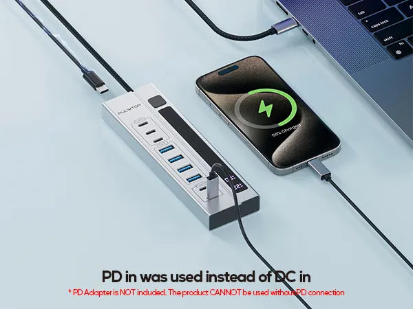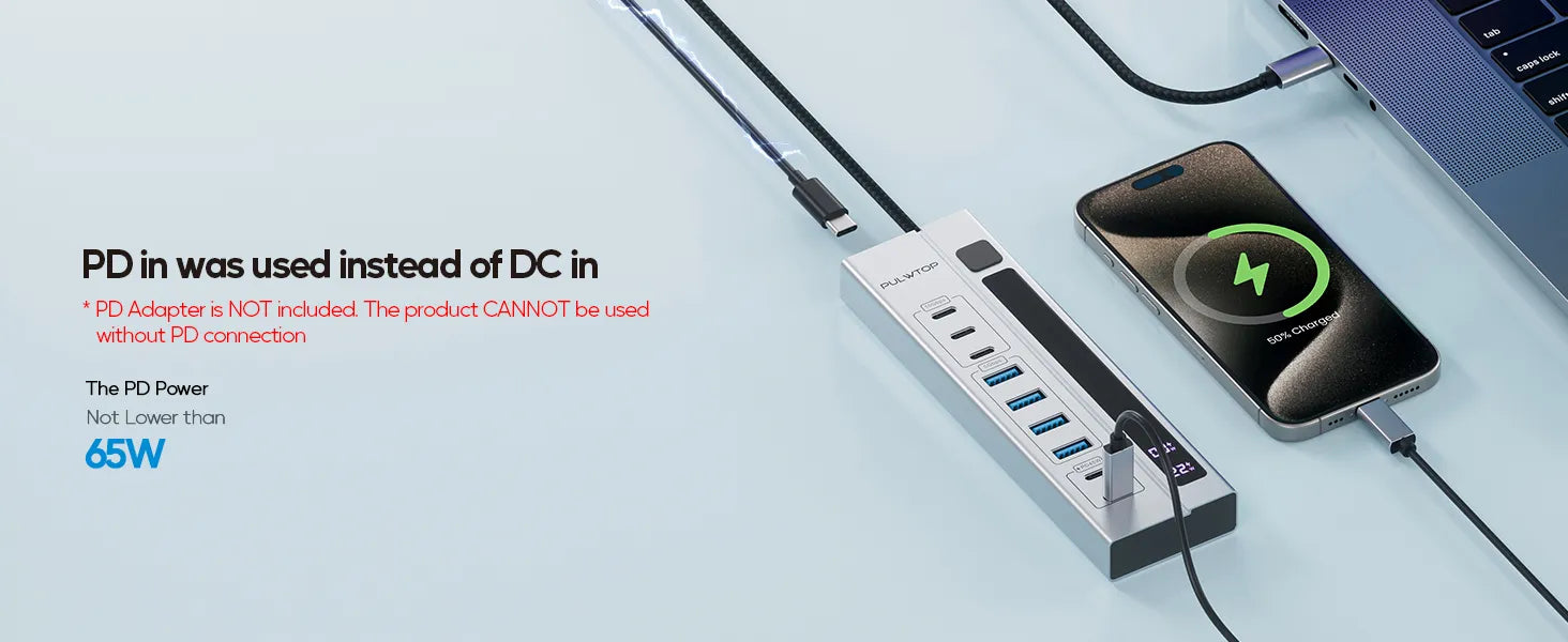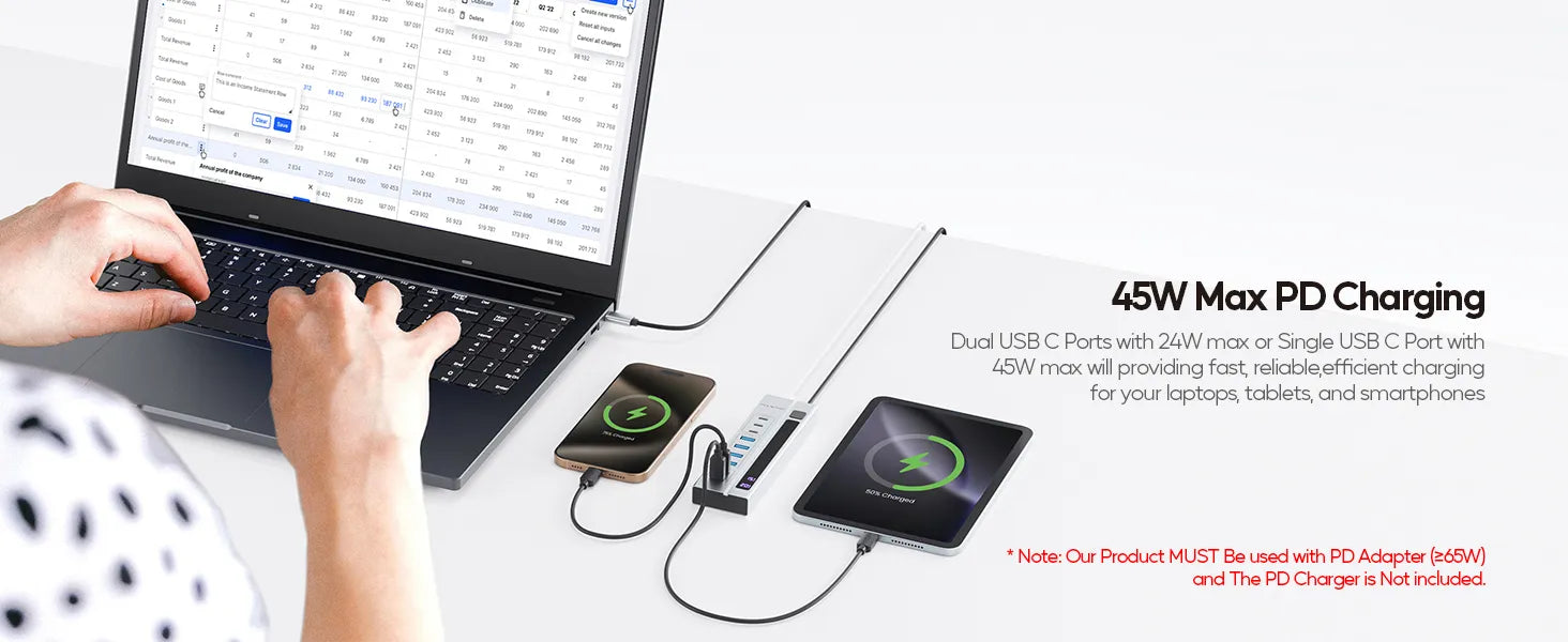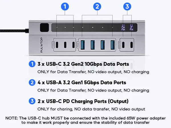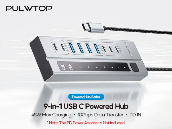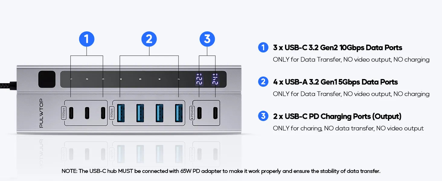 - 9-IN-1 MULTIPLE CONNECTIVITY - Designed for multitasking, our 9-in-1 powered usb-c hub is equipped with 1× USB-C PD-in port, 3 x USB-C 3.2 gen2 10Gbps data ports, 4 x USB-A 3.2 Gen1 5Gbps data ports and 2 x USB-C PD charging ports, catering to the diverse needs of multi-device connection, data transfer and charging. ★NOTE: As power adapter is NOT inlcuded, please connect your own PD adapter (Greater than 65W) to the USB-C hub to make it work properly and ensure the stability of data transfer