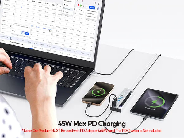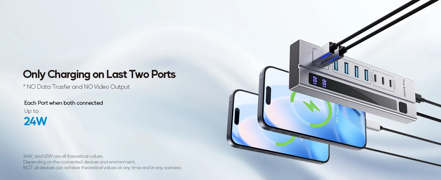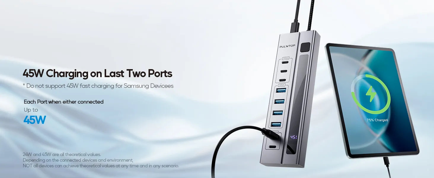 - TWO PD CHARGING PORTS - The USB C hub powered features with a USB-C PD-in port (Power Adapter NOT included), and 2 extra USB-C PD charging ports that support pass-through charging up to 20V@3A, 45W (Max) for fast charging your iPad, iPhone 15/Pro/Max, tablets and other Type-C devices. ★Note: 1). The two charing port ONLY support charing, NO data transfer & video output. 2). Support up to 24W/each when both connected or up to 45W output when either connected, NOT support 45W fast charging for Samsung devices. 3) Please connect your own PD adapter (Greater than 65W) to the USB-C hub to make it availabe for Charging and ensure the stability of data transfer
