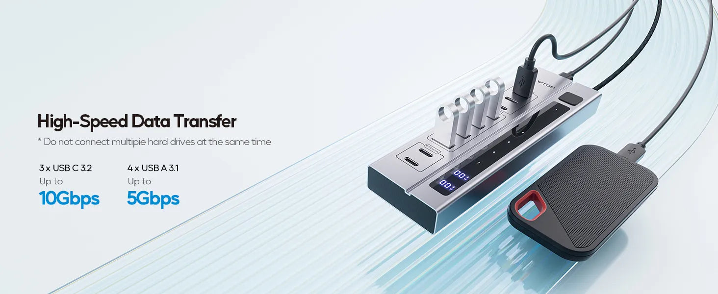 - FASTER SPEED WITH USB 3.2 - PULWTOP USB C 3.2 hub can help you to expands your laptops/tablets that with a limited USB-C port to 7 external extra USB-C/A data ports for keyboard, mouse, printer, hard drivers and other USB-A/C devices. Easy to synchronise data at blazing speeds up to 5Gbps for USB-A and 10 Gbps for USB-C, fast enough to transfer files, audio, and HD video in seconds. ★Note: All the Data Ports of this USB C hub adapter DO NOT support the Video Output and Charging.