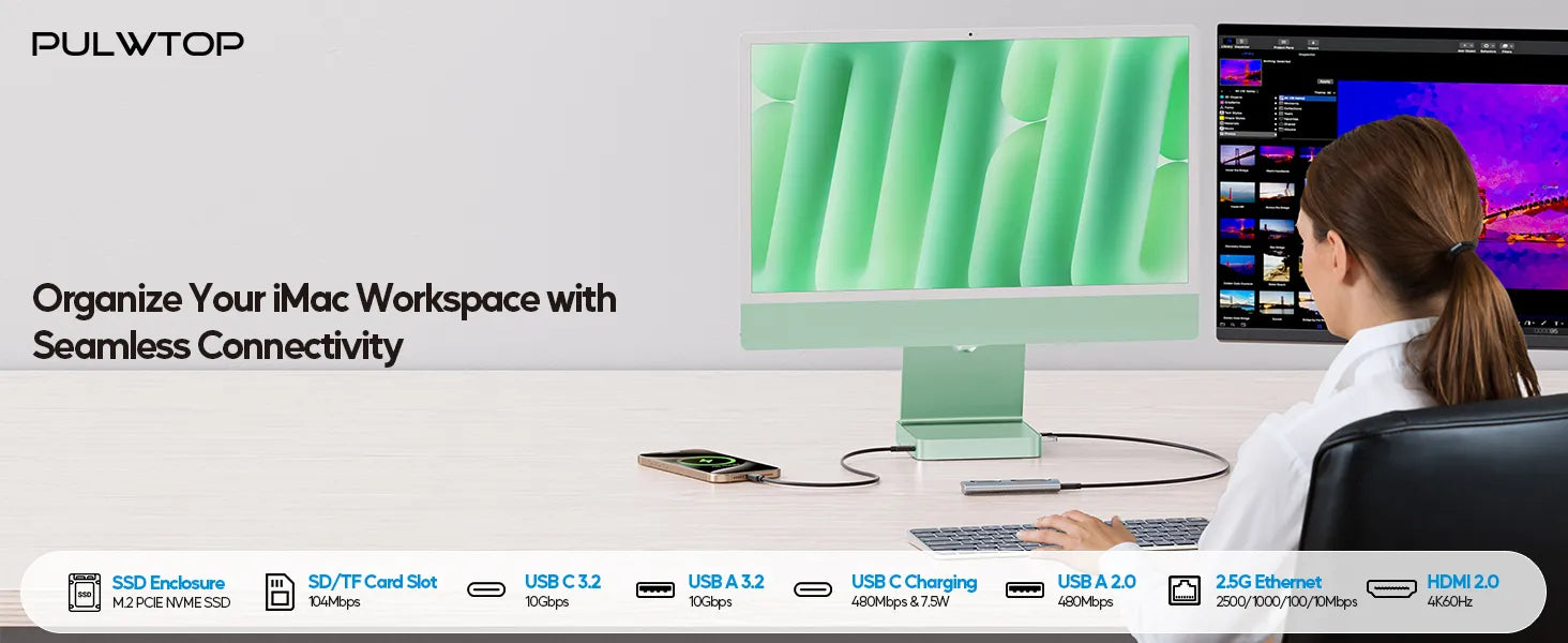 - 11-IN-1 USB C HUB DESIGNED FOR IMAC 24 INCH - Custom-designed for iMac 24 inch 2021/2023/2024, both an iMac dock stand and an iMac hub docking station. As a functional imac 24 inch accessories, this imac hub features a 4K 60Hz HDMI, M.2 SSD enclosure, 2.5G ethernet, USB C 3.2 Gen2 10Gbps, USB A 3.2 Gen2 10Gbps, USB C 2.0 with BC1.2 7.5W charging, 2 x USB A 2.0, SD/TF card reader, 3.5mm audio/mic jack, providing comprehensive connectivity and powerful productivity for your iMac