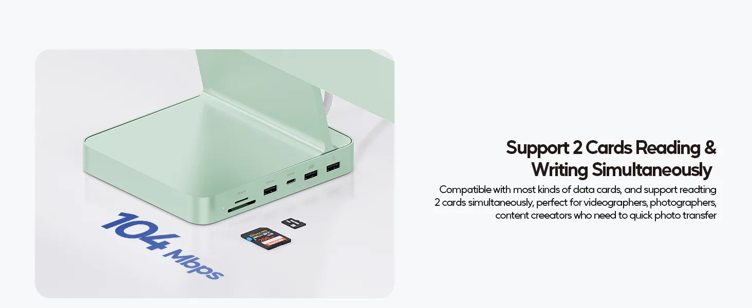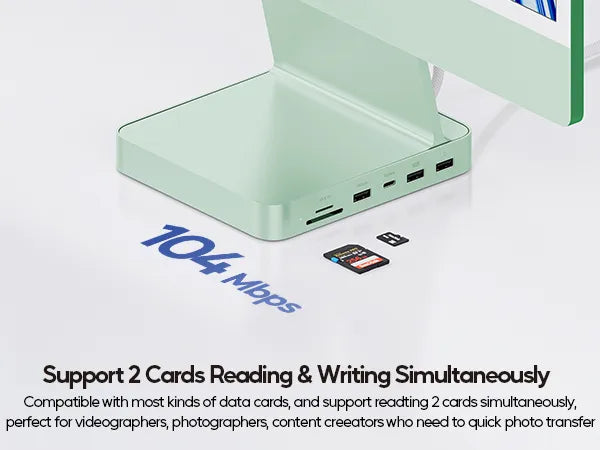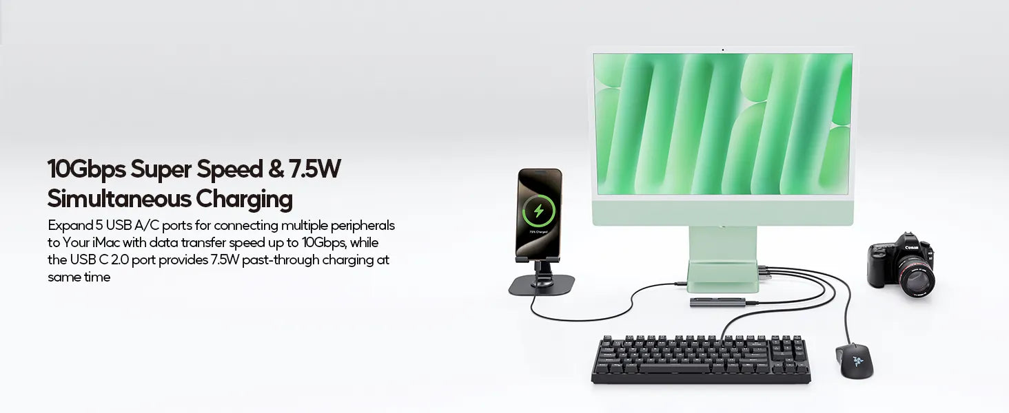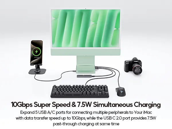 - UP TO 10GBPS SUPER SPEED & 7.5W SIMULTANEOUS CHARGING - The imac multiport adapter features with 10Gbps USB-A/C 3.2 Gen2 data ports that support read and write speed up to 1000-1200MB/s, transmiting 1G large files in seconds. Connect your phone or other USB-C device to the 7.5W USB C 2.0 data port to get simultaneous charging. 2 x USB A 2.0 ports, 3.5mm audio/mic jack and SD/Micro SD card readers for seamlessly access to mouse, keyboard, and other essential peripherals at once