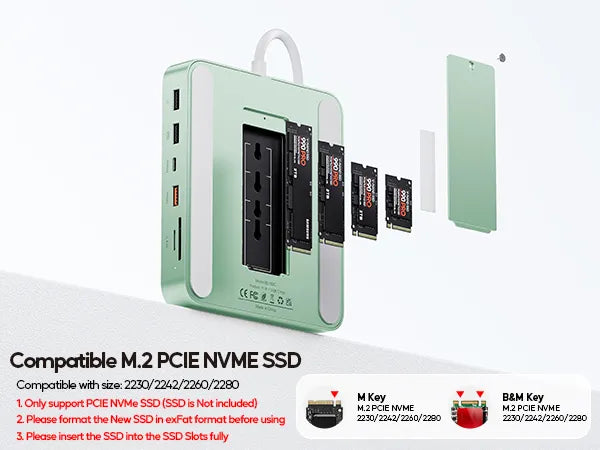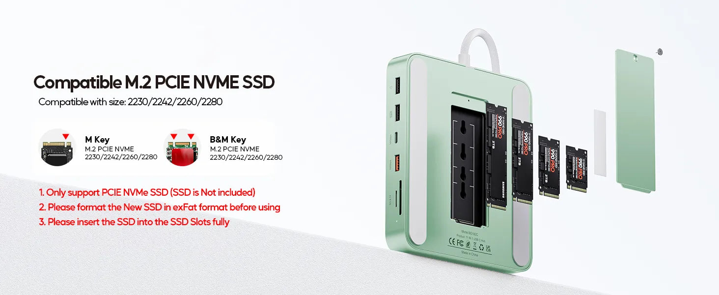 Supports up to 4TB/10Gbps M.2 NVMe PCIe or SATA SSD in 2230/2242/2260/2280 form factors. NOTE: 1) DO NOT support SSDs with a heatsink. 2) Please format your new SSD in exFat format before use