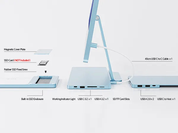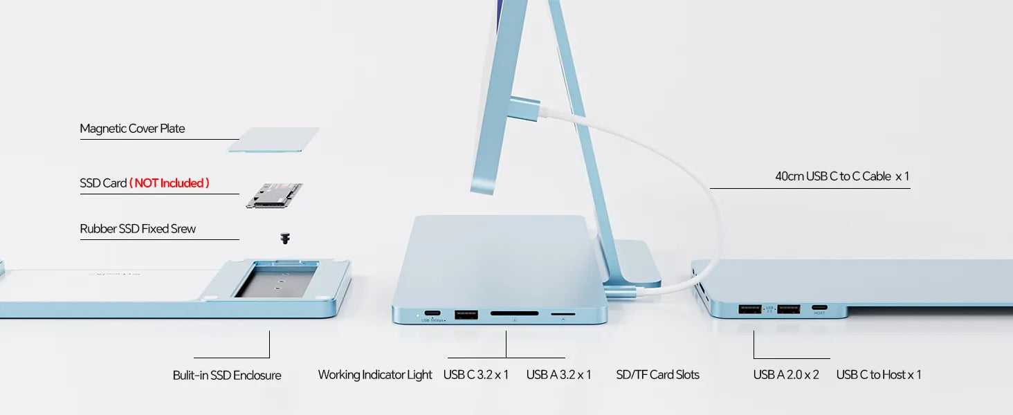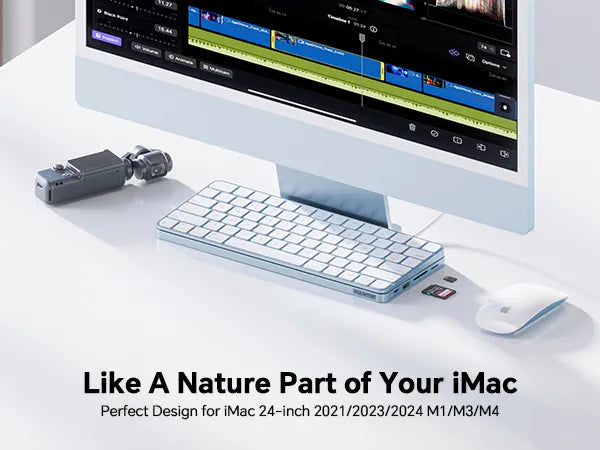 - 8-IN-1 USB C SLIM DOCK DESIGNED FOR IMAC 24 INCH - Exclusively-designed for iMac 24 inch 2021/2023/2024. As a functional imac 24 inch accessories, this imac hub features a USB-C port to connect iMac (up to 10 Gbps), M.2 NMVe SSD enclosure to add extra memory up to 2TB (SSD card NOT included), USB C 3.2 Gen2 10Gbps, USB A 3.2 Gen2 10Gbps, 2 x USB A 2.0, SD/TF card reader slots to extend your USB ports for data transfer and easy access to peripherals