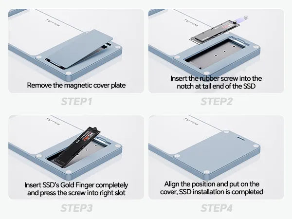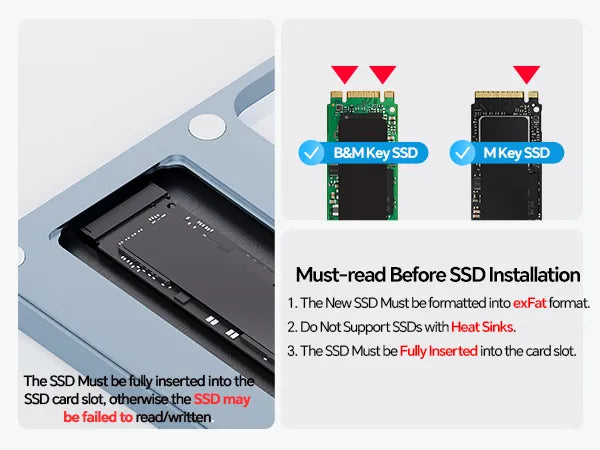NOTE: 1) DO NOT support SSDs with a heatsink. 2) Please initialize the new SSD because SSDs must be formatted to work with host in order for SSD to mount and show up