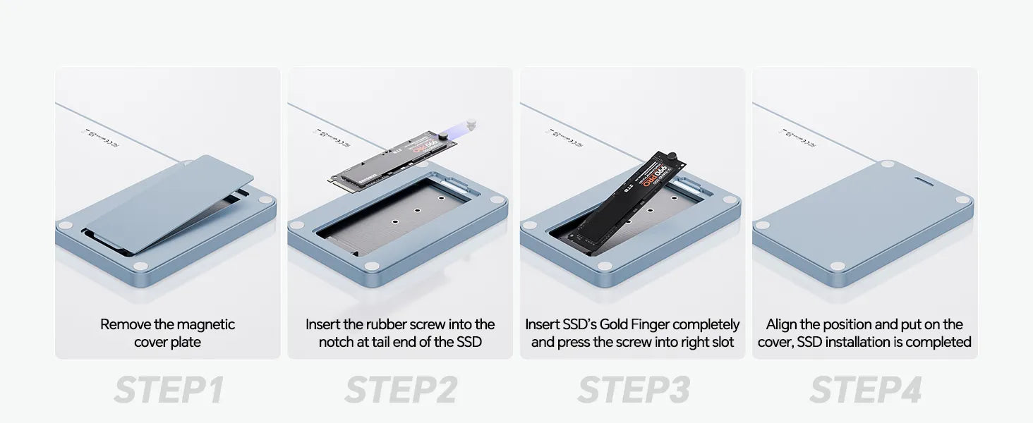 Supports up to 2TB/10Gbps M.2 NVMe PCIe or SATA SSD in size of 2242/ 2260/ 2280