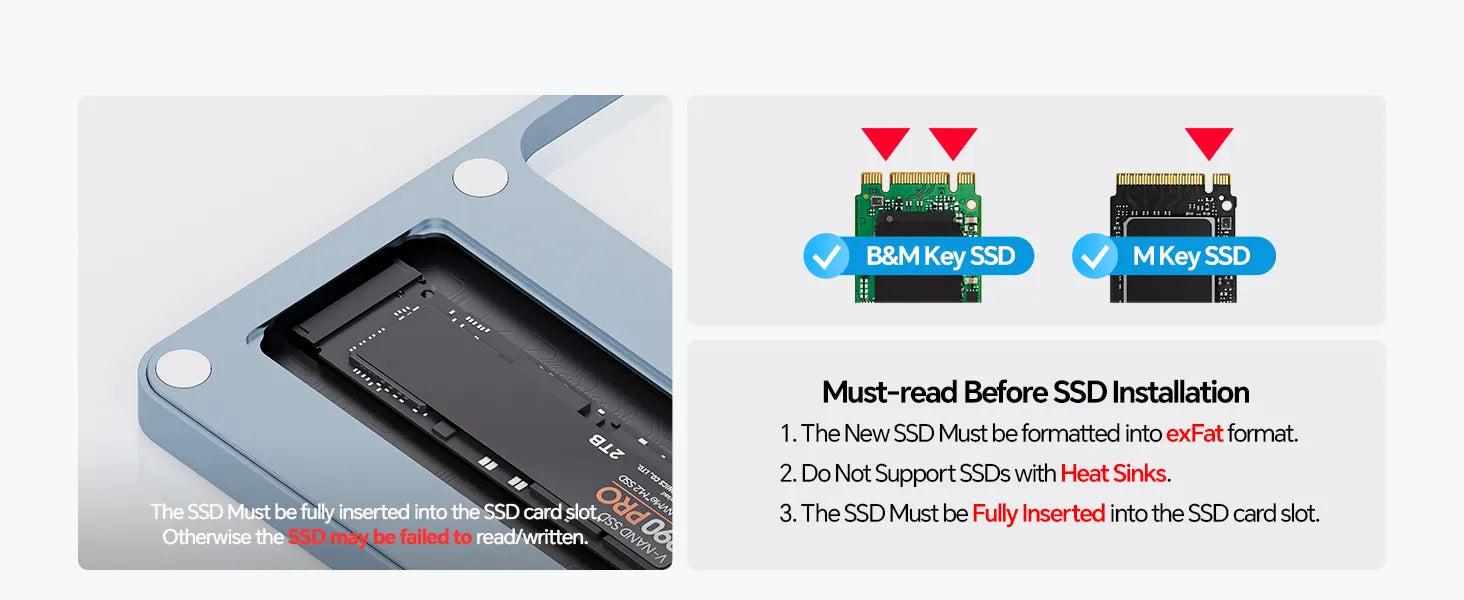 - SUPPORTS M.2 NVME SSD EXPANSION - Equipped with an external hard drive slot at the bottom, this imac m4 docking station supports up to 2TB/10Gbps M.2 NVMe PCIe or SATA SSD in size of 2242/ 2260/ 2280 (SSD NOT included). An ideal imac usb dock for the 2021 2023 2024 imac 24 inch users who needs additional storage. ★NOTE: 1) DO NOT support SSDs with a heatsink. 2) Please initialize the new SSD because SSDs must be formatted to work with host in order for SSD to mount and show up. 3) If your SSD are new, please format your new SSD into "exFat" or "apfs " format.