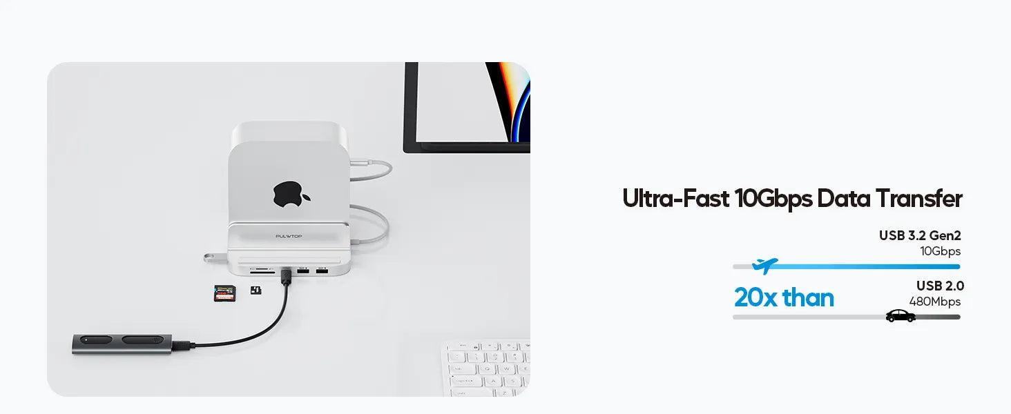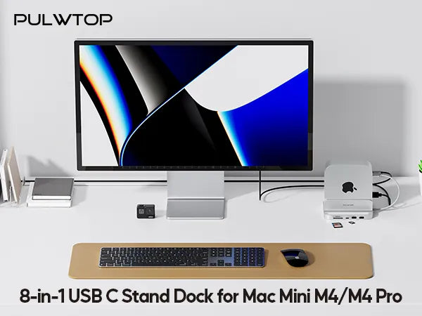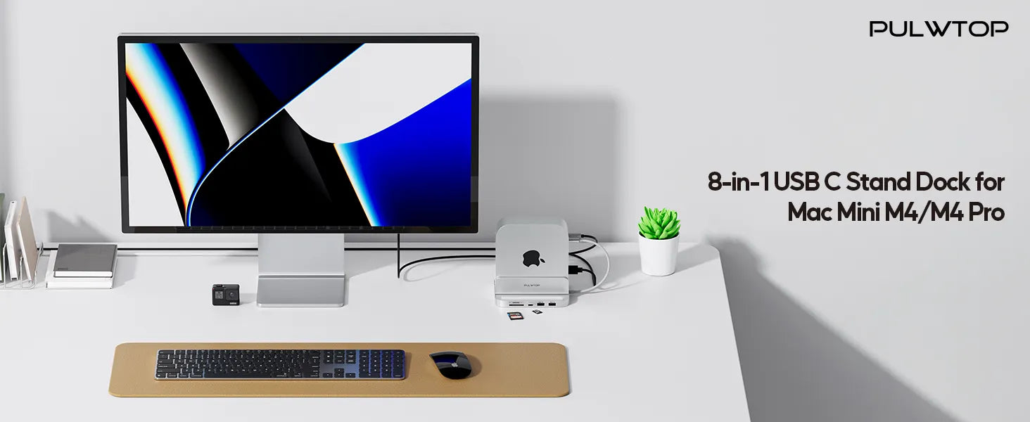 PULWTOP Mac Mini M4 Vertical USB C Hub& Stand(8-in-1, M.2 SSD case, 10Gbps)