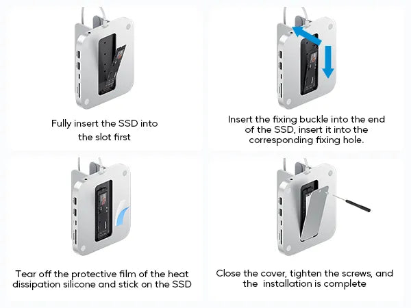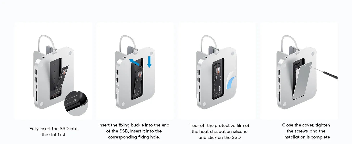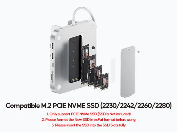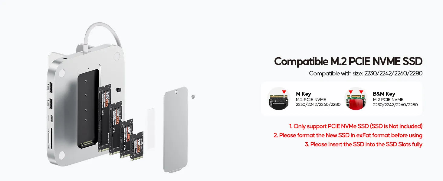 UP TO 4TB M.2 SSD EXPANSION - PULWTOP Mac Mini M4 Pro Hub supports up to 10Gbps M.2 PCIe NVMe SSD expansion. The SSD enclosure of Mac Mini 2024 dock is compatible with NVMe protocol (B+M Key/ M Key) SSDs in sizes of 2230/ 2242/ 2260/ 2280 and up to 4TB expansion. ★NOTE: 1) SSD NOT Included. 2) DOES NOT support SATA SSDs; 3) Please initialize the new SSD because SSDs must be formatted to work with host in order for SSD to mount and show up; 4) Please format your new SSD into "exFat" or "apfs " format