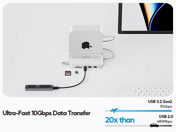 - EXPAND 8 PORTS FOR YOUR MAC MINI M4 2024 - The Mac Mini M4 Hub features a 10Gbps USB C data port & USB-A data port, 2 x USB-A 2.0 data ports (480Mbps), Micro/SD Card Readers (104 Mbps), a 3.5mm Audio/Mic jack, an up to 4TB M.2 SSD slot for convenient access to the essential peripherals and external memory expansion. Equipped with a 40cm non-detachable TPE cable (USB-C Male/up to 10Gbps) to connect and expend your Mac Mini 2024. NOTE: All USB-A ports do not support CD readers, Apple SuperDrive