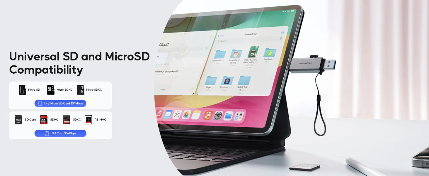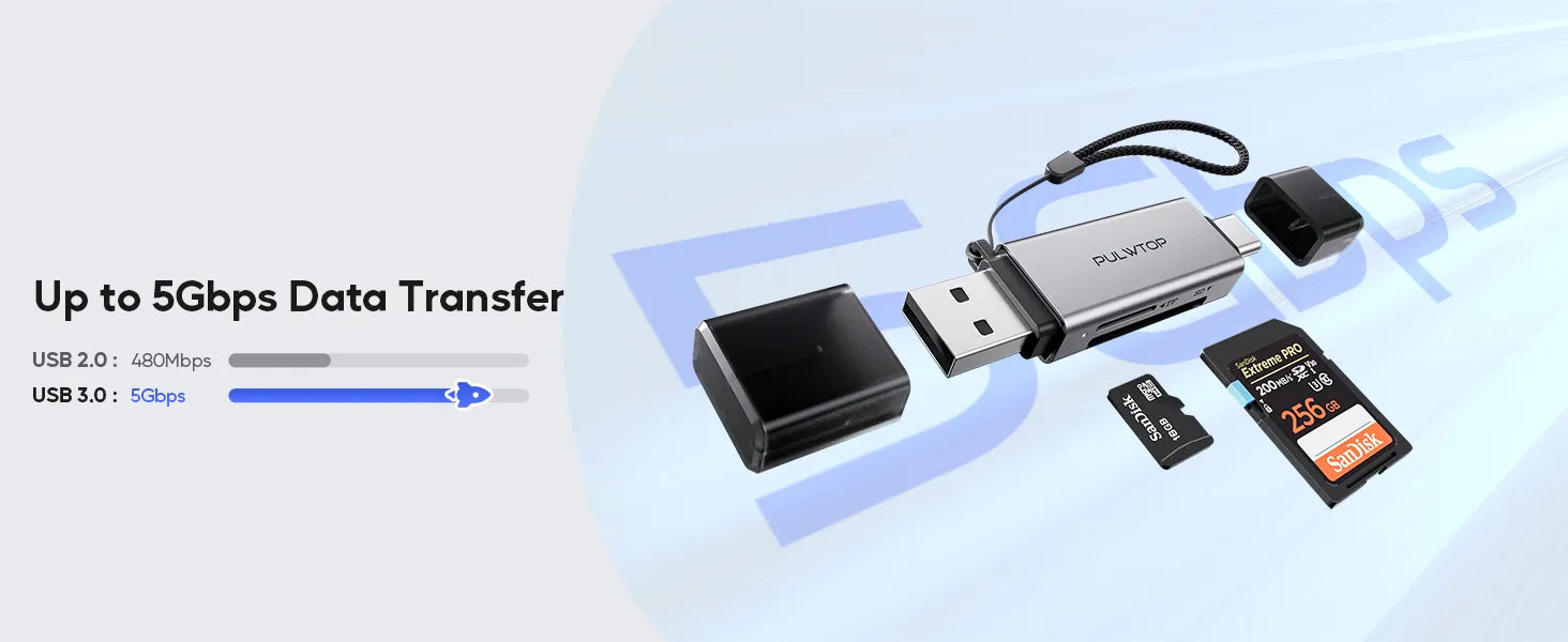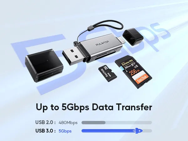 The PULWTOP SD card reader combines USB A and USB C interfaces, allowing you to write and read SD/Micro-SD cards up to 2TB. When connected to a USB 3.0 host, the transmission speed reaches 5Gbps, 10 times faster than a USB 2.0 port, allowing you to transmit high-resolution images, videos and large files in just a few seconds. Compatible with USB 2.0 and USB 1.1.