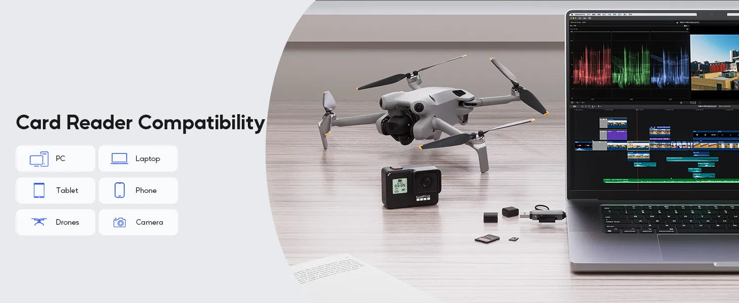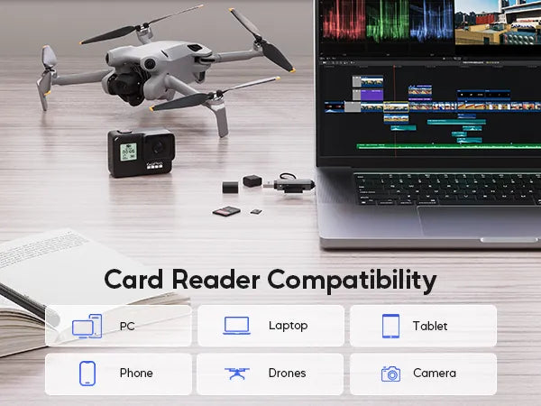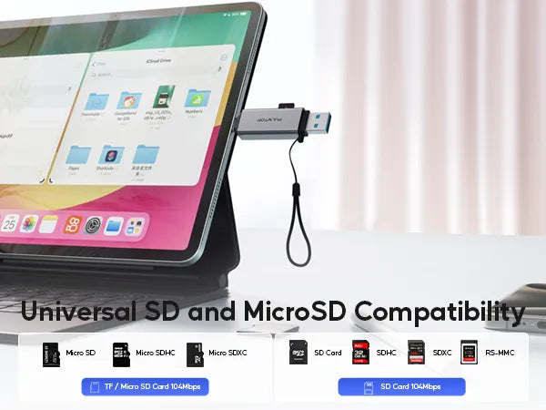 This memory card reader supports cards such as SD, SDHC, SDXC, RS-MMC, MMC, Micro SD, Micro SDHC, Micro SDXC, Micro SD/TF, UHS-I. A universal USB card reader for USB C Android smartphones, iPhone 15 16 Pro Max, USB C tablets, MacBook, iMac, Windows PCs, and compatible with a variety of devices, including PS4, Xbox One, iPad Pro 2020/2018, Macbook series, Dell XPS 15/13, Surface Book 2, Surface Laptop, Galaxy Tab S6/Galaxy S20.