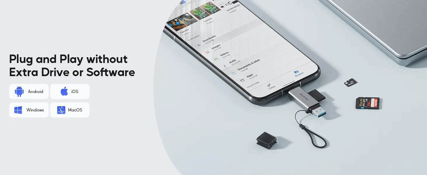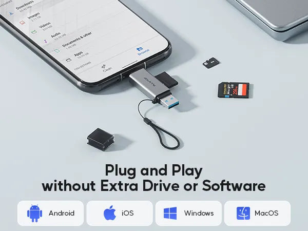 This Type C card reader can easily transmit and backup data anytime, anywhere to devices such as the iPhone 15 16 series, Android smartphones and tablets, equipped with Type-C OTG function. Easy to use, no need for a driver and just plug it in. Note: Your model must support OTG function.