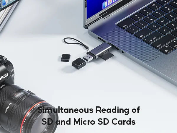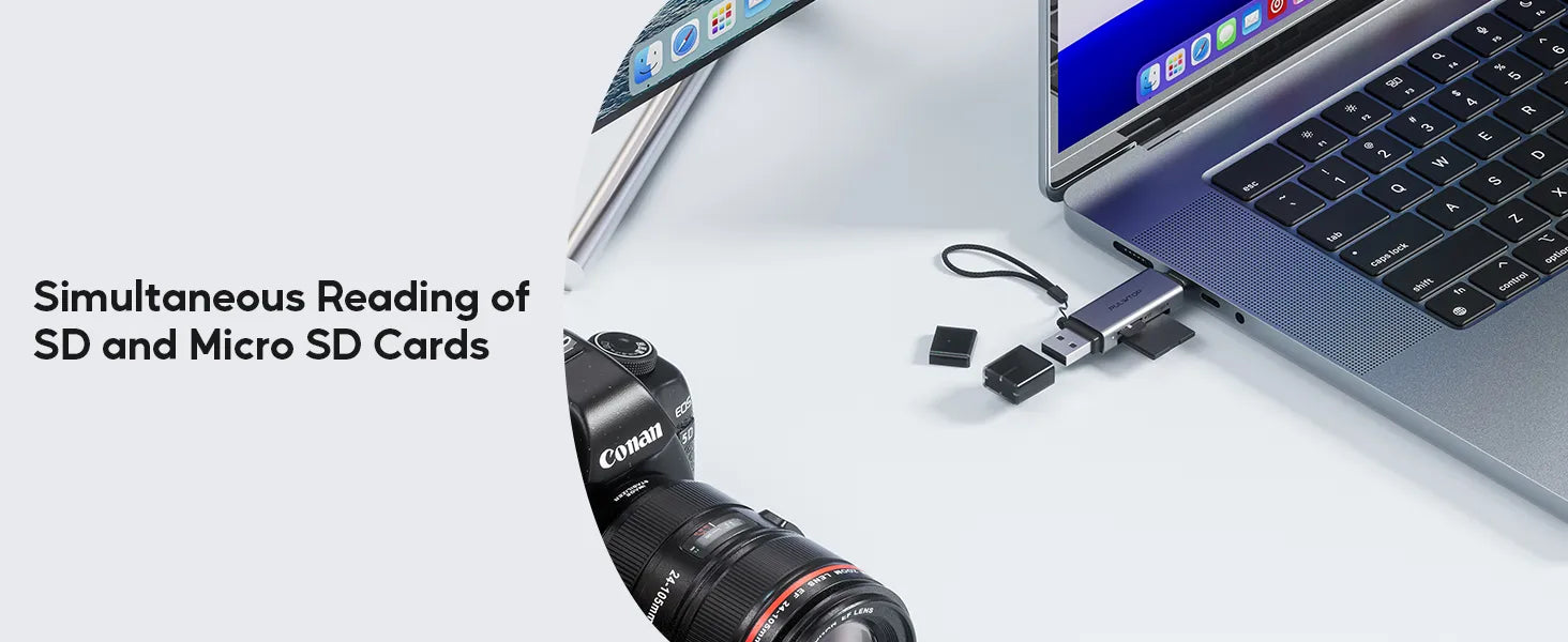 Two card slots are expanded to allow you to read and write Micro SD cards and SD cards at the same time. A USB SD card reader can avoid reinserting and ejecting the card reader, and can also be used next to a USB port used for other peripherals without interference. Note: 1. Since it is shared between two card slots, transmission speed may be slower if used at the same time. 2. The NTFS format only supports read on macOS and Linux. If you are using different systems at the same time, it is recommended to format the SD as exFAT.
