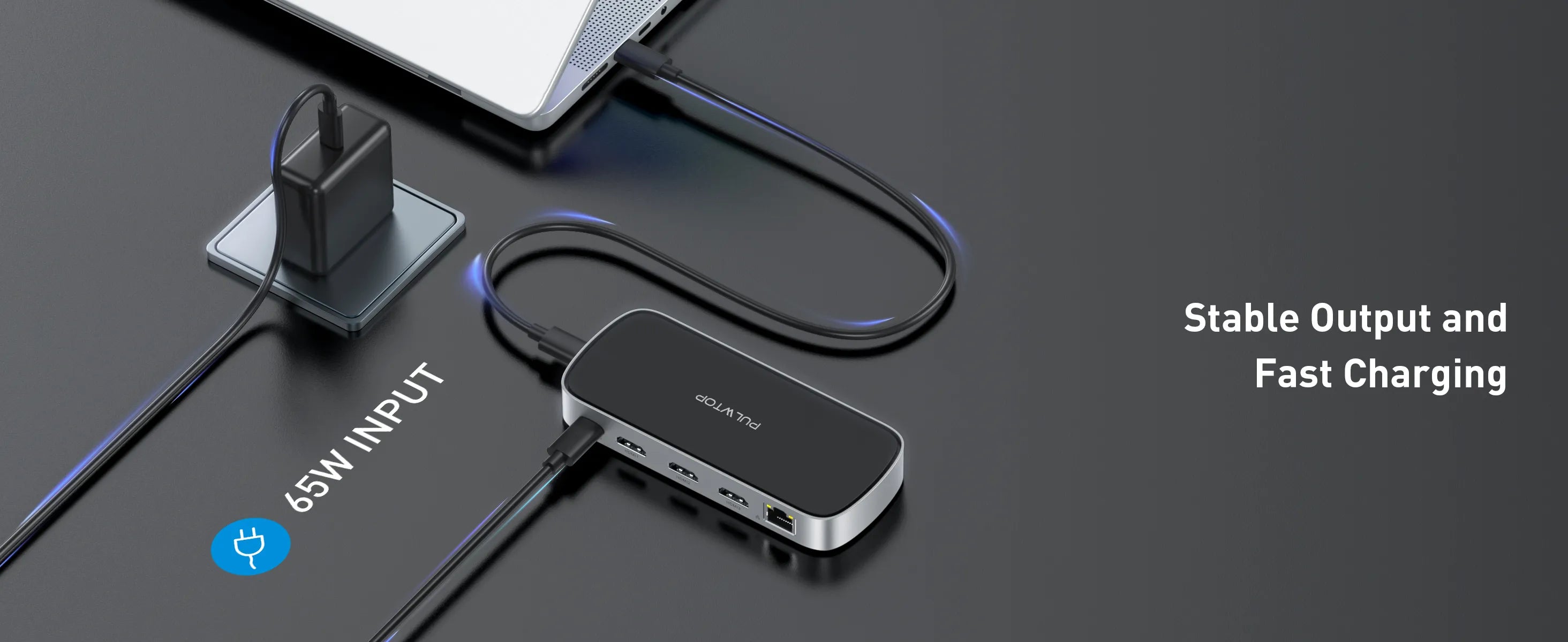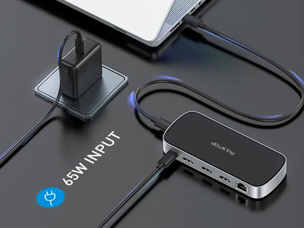 5. Included 65W Power Supply: For more stable experience, we have matched 65W adpter in the box, you can offers up to 50W to charge your laptop directly ( Ps: the adpter with US/UK/EU plug), The dock support PD100W max, if you need to use the adapter by yourself, we recommend to use the adapter above 60W.