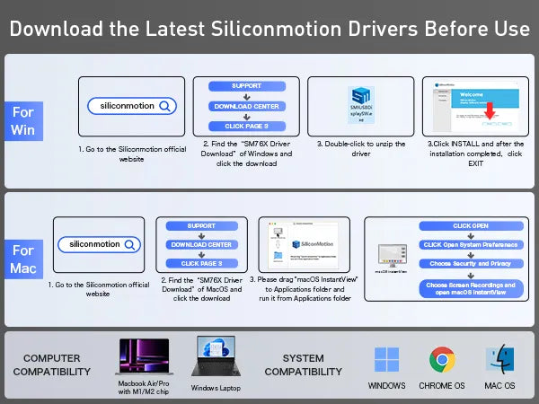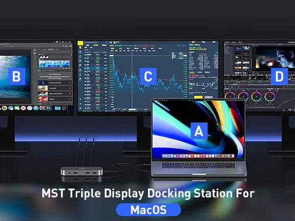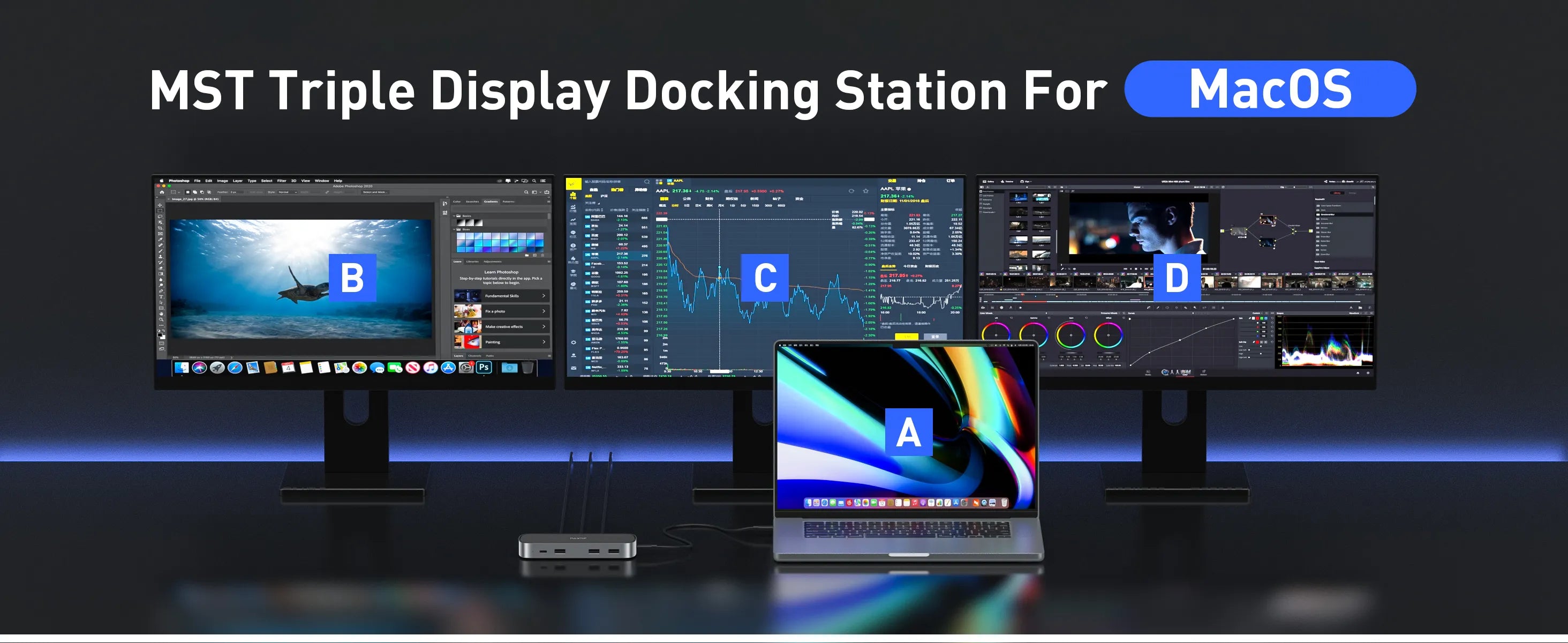 1. M1/M2 MacBook Triple Display: After installing the Siliconmotion driver, PULWTOP docking station can break the single extend display limitation of M1/M2 Macbook . It can extend triple monitor to make your own workspace. Note: The triple expansion function of PULWTOP universal docking station can only be used after installing the Siliconmotion driver.