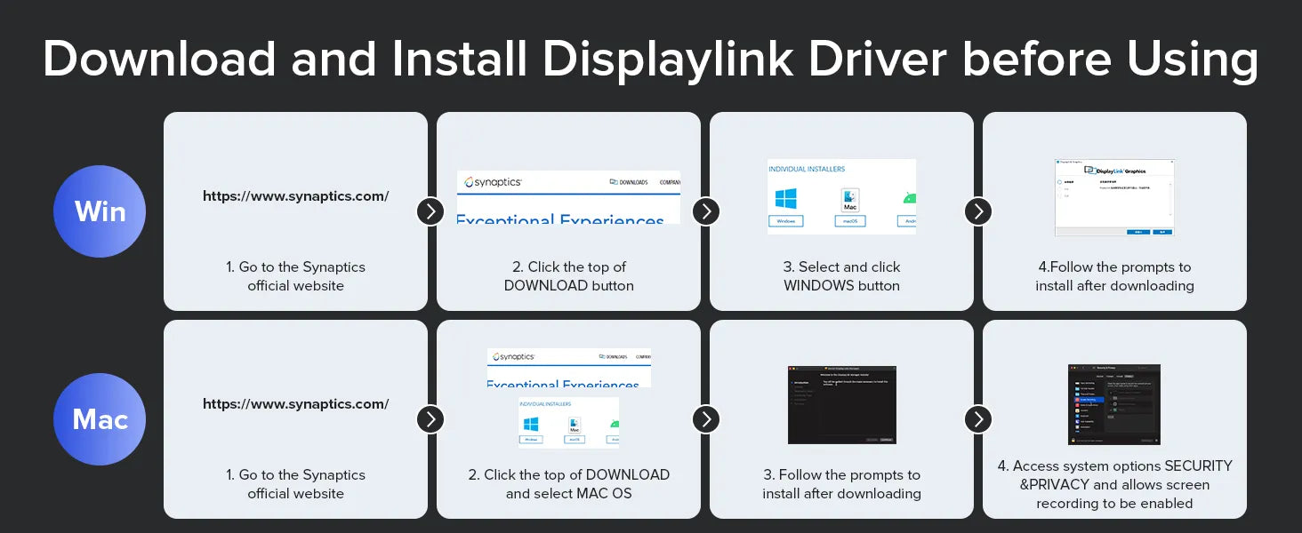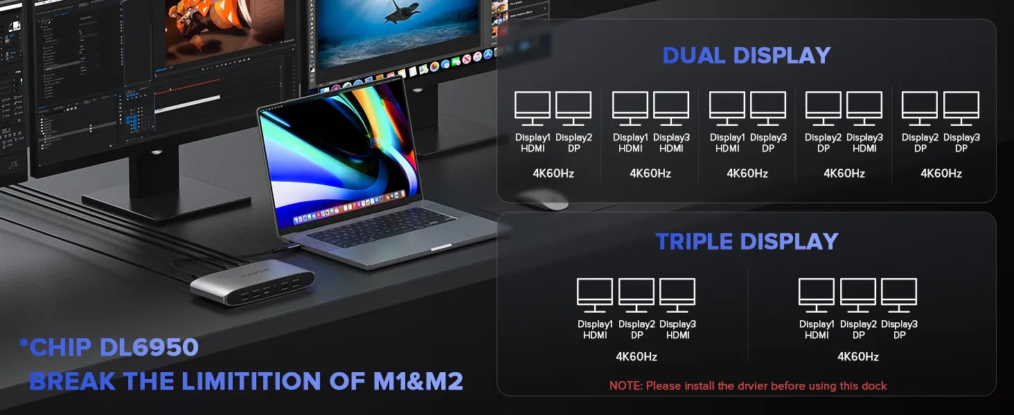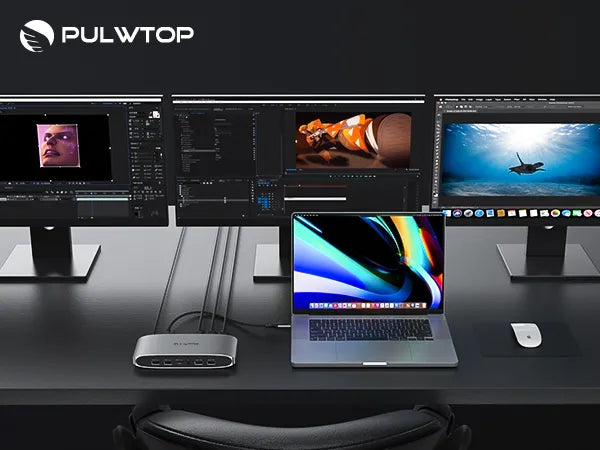- M1/M2 MacBook Triple Display: After installing the DisplayLink driver, PULWTOP docking station can break the single extend display limitation of M1/M2 Macbook . It can extend triple monitor to make your own workspace. Note: The triple expansion function of PULWTOP universal docking station can only be used after installing the DisplayLink driver.