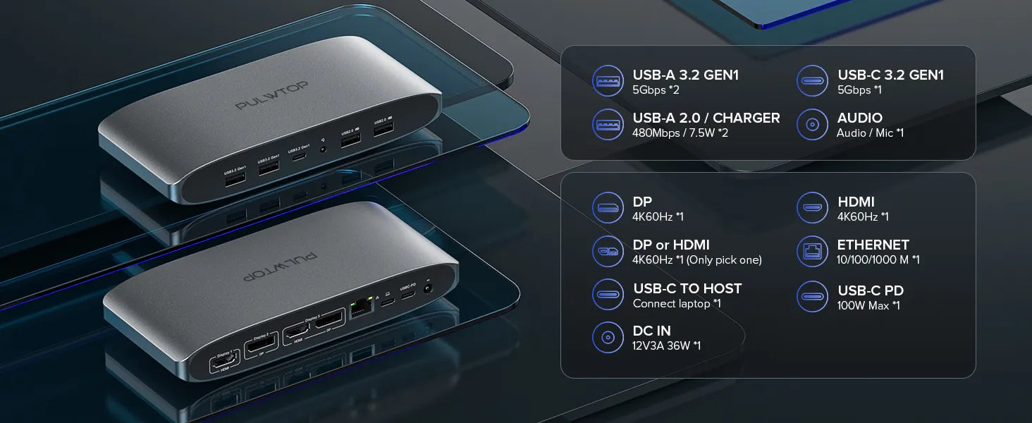 - Extensive Connectivity: The DisplayLink docking station with 36W power adapter 12 total ports, including 2*4K HDMI, 2*4K displayport, 2* 5Gbps USBA 3.2 Gen1 port(only data), 5Gbps USB C 3.2 Gen1 port(only data), 100W USB-C PD(Max), 2*USBA 2.0 ports(data & charge), Gigabit Ethernet, 3.5 mm audio/Mic jack. Note: The PULWTOP USB C docking station must be connected with the included 36W adapter to use!
