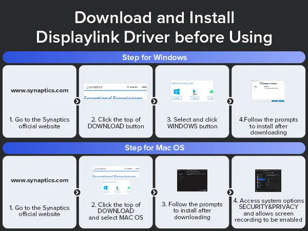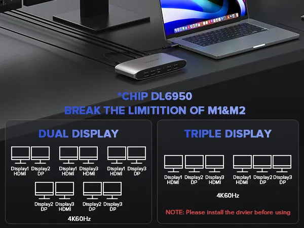 - 4K Triple Display Extension: Just installing the DisplayLink driver, you can achieve triple monitor display. HDMI(Display 1)+DP(Display 2)+DP or HDMI(Display 3) all displays can reach 4K@60HZ(Under DP1.4). Macbook docking station mirror mode and extend mode can be used based on your needs. (Support both SST & MST) Note: HDMI and DP ports in the display 3 of DisplayLink docking station can only choose one of the two.