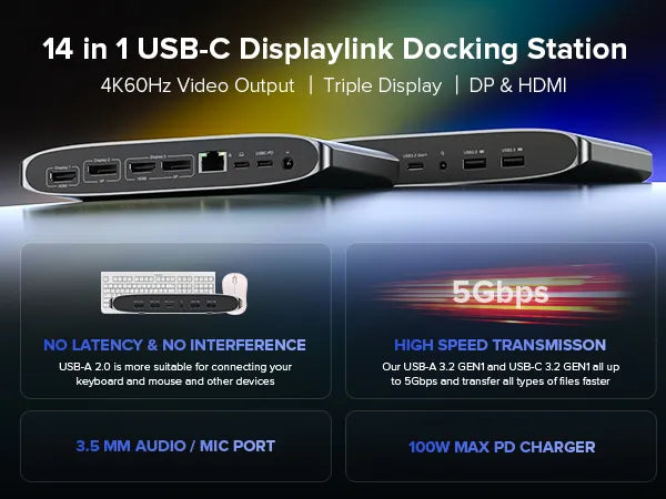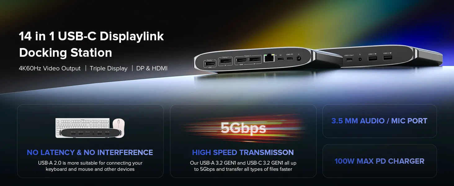 PULWTOP Displaylink Triple Monitor Universal Dock (14-in-1), USB C Laptop Dock with HDMI and DisplayPort, PD, USB-C Data, USBA, Ethernet, Audio