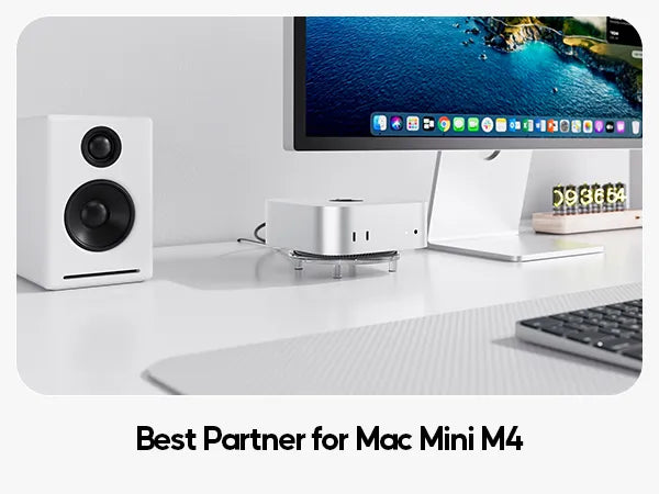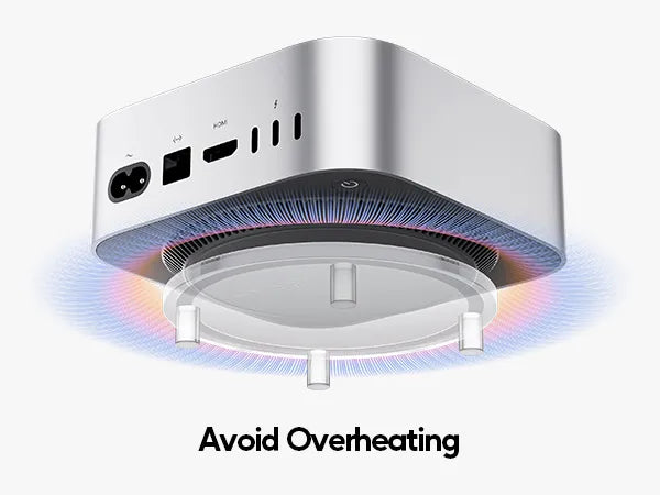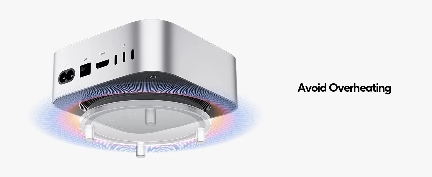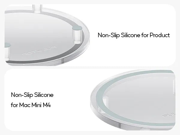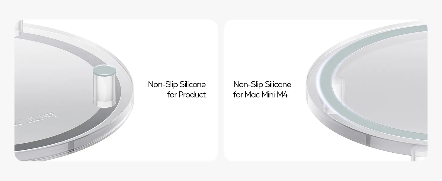 【Secure & Stable Base】Anti-slip silicone pads keep your Mac Mini M4 Dock Stand firmly anchored, preventing scratches on your desk and reducing vibrations. The elevated design promotes better airflow to prevent overheating.