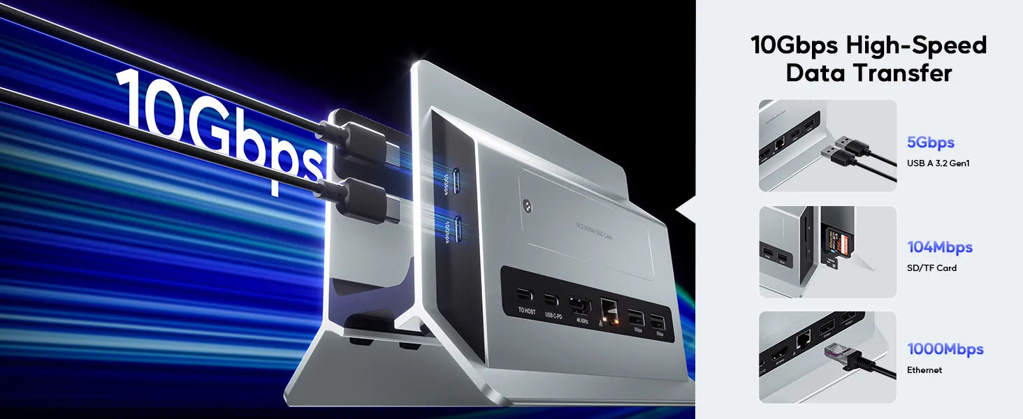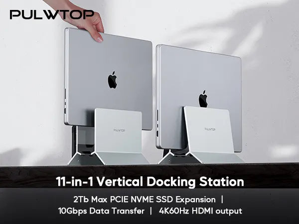 - 11 IN 1 MacBook DOCKING STATION - PULWTOP macbook docking station is designed with a 4K@60Hz HDMI, 2 x USB A 3.0 5Gbps, 2 x USB C 3.2 10Gbps, 10Gbps/2TB M.2 NVMe SSD expansion slot, USB C to host, USB C PD in 100W Charge port, SD/ TF card reader, RJ45 Ethernet port (10/100/1000Mbps). ★NOTE: 1) The connected USB-C port of your laptop has to support transfer data, video and charging; 2) Please use a power adapter greater than 65W to ensure stable power for your Macbook/Laptops; 3) Power Adapter and power cable is NOT included