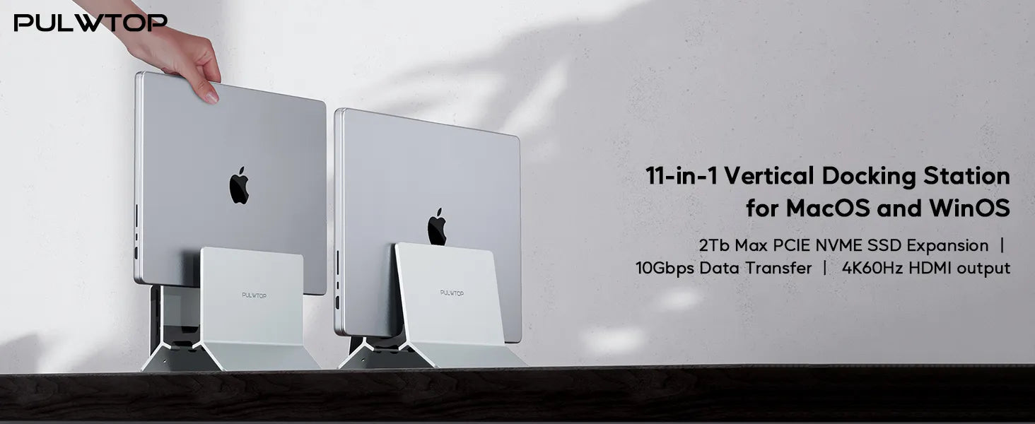 PULWTOP USB C docking station with vertical stand ( 11-in-1, HDMI, USB-C 10Gbps, M.2 NVME SSD case) Grey