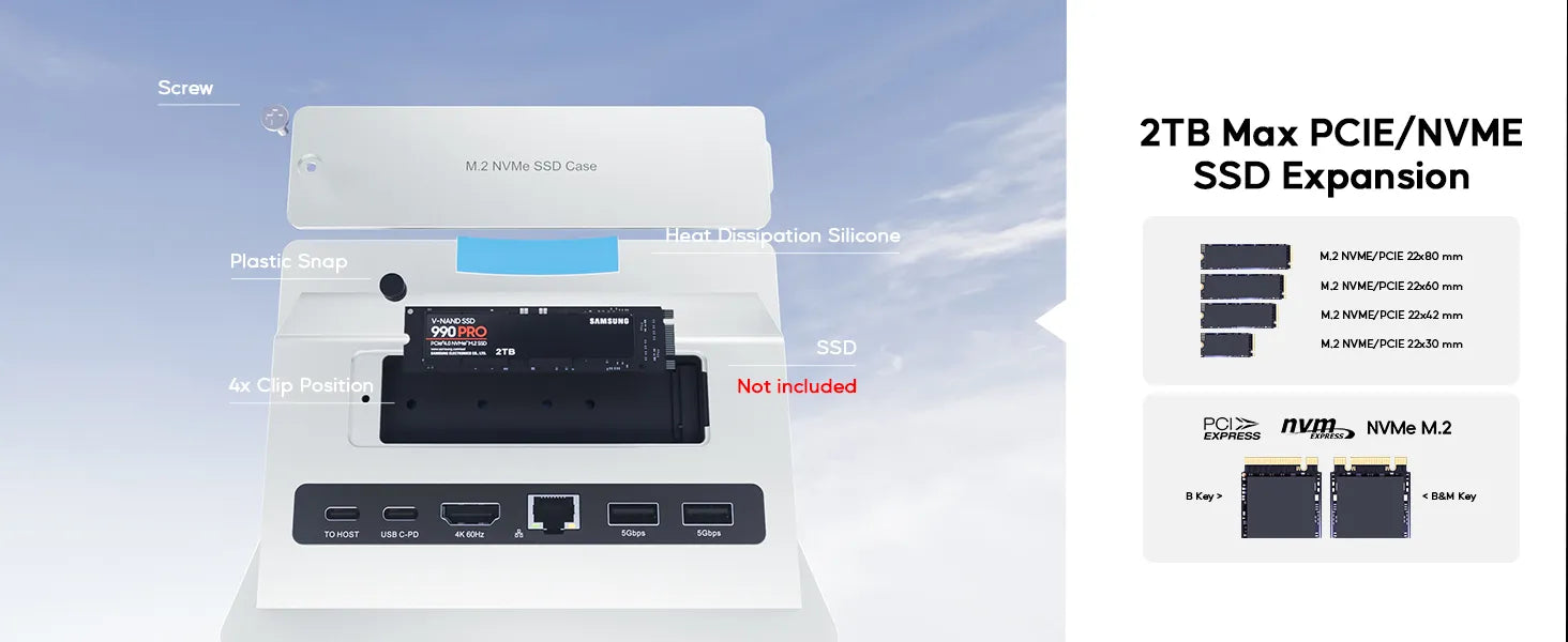 - SUPPORT M.2 SSD EXPANSION - This vertical laptop docking station supports SSD expansion up to 2TB and transfer speed up to 10Gbps. Compatible with PCIe NVMe M.2 SSDs in sizes of 2230/ 2242/ 2260/ 2280. Easy to expand the external hard drive to meet the insufficient storage needs of Mac Mini, Macbook and other USB-C laptops. ★NOTE: 1). SSD is NOT included; 2). NOT support SATA SSDs and SSDs with heat sinks; 3) If your SSD are new, please format your new SSD into "exFat" or "apfs" format