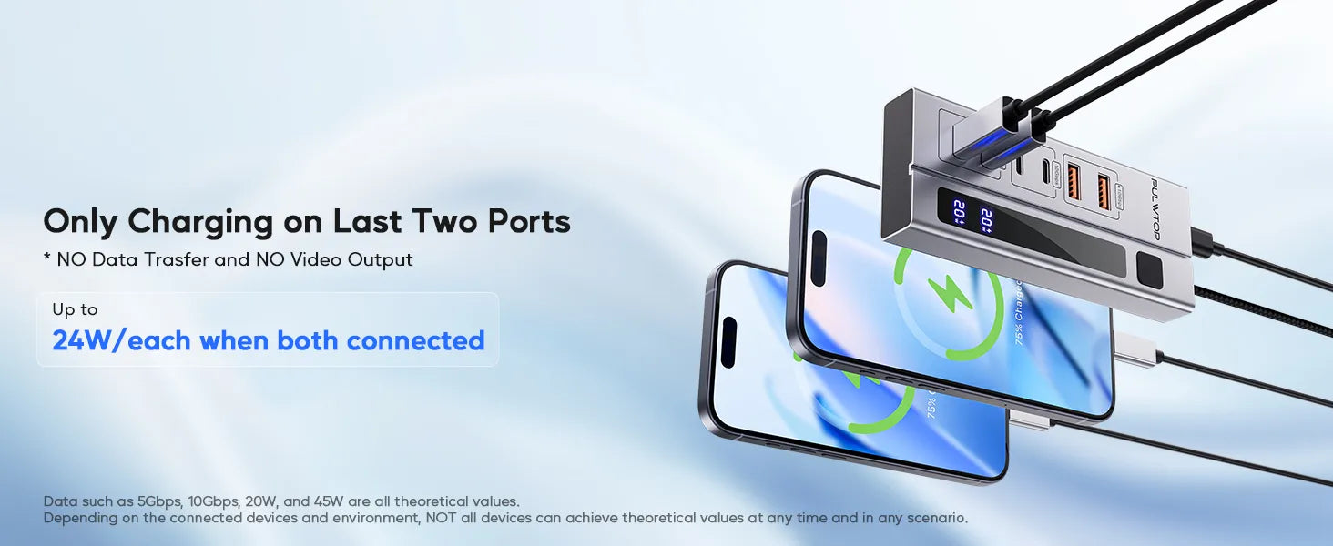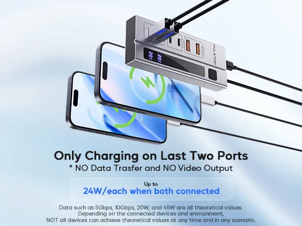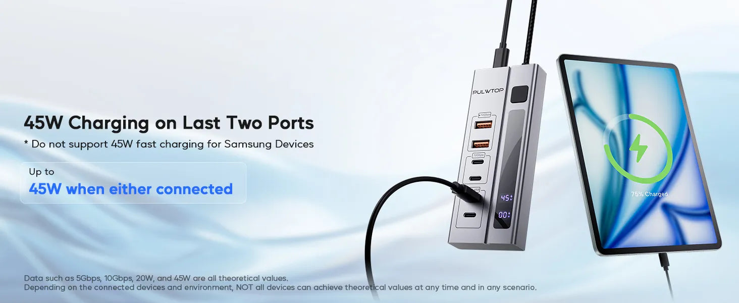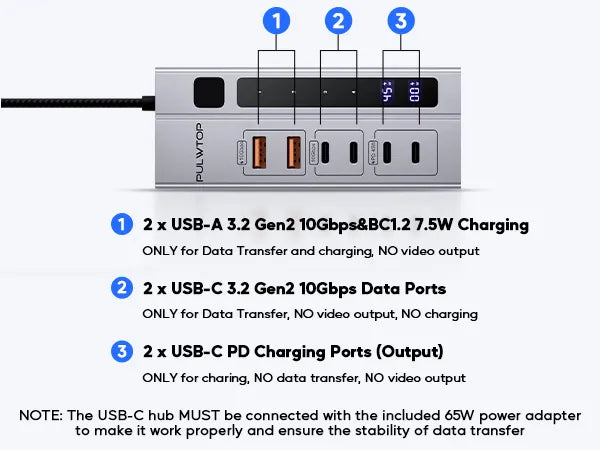 - 65W POWER ADAPTER & PD CHARGING PORTS - The USB C hub powered includes a 65W AC power adapter with detachable USB-C to USB-C charging cable, and features with 2 extra USB-C PD charging ports that support pass-through charging up to 20V@3A, 45W (Max) for fast charging your iPad, iPhone 15/Pro/Max, tablets and other Type-C devices. NOTE: 1). The two charing port ONLY support charing, NO data transfer & video output. 2). The PD ports support 1 x 45W Max or 2 x 24W Max, NOT support 45W fast charging for Samsung devices.