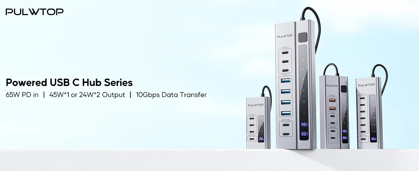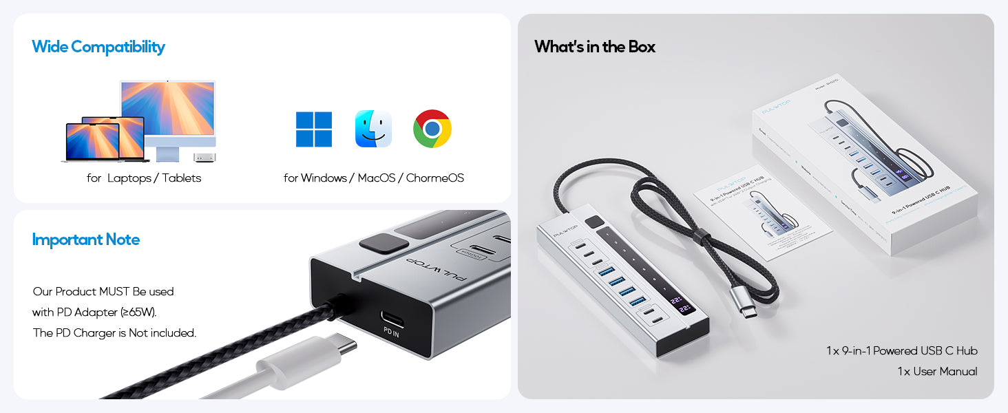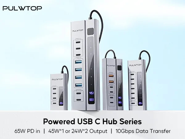 PULWTOP 9-in-1 Powered USB C Hub, USB 3.2 Data Hub with 65W PD-in Power Adapter