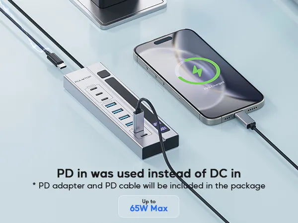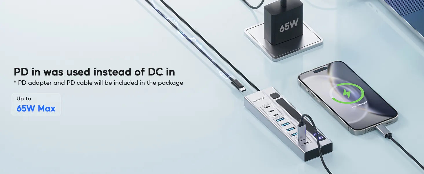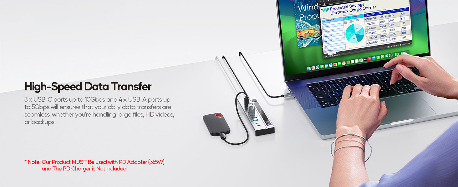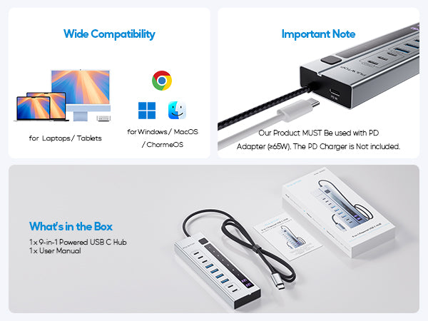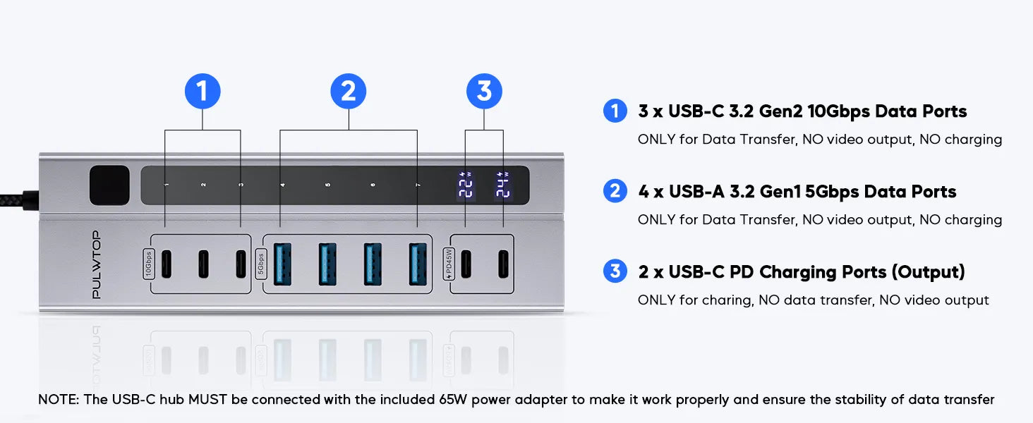 - 9-IN-1 MULTIPLE CONNECTIVITY - Designed for multitasking, our 9-in-1 powered usb-c hub is equipped with 1× 65W USB-C PD-in port & power adapter, 3 x USB-C 3.2 gen2 10Gbps data ports, 4 x USB-A 3.2 Gen1 5Gbps data ports and 2 x USB-C PD charging ports, catering to the diverse needs of multi-device connection, data transfer and charging. NOTE: The USB-C hub MUST be connected with the power adapter to make it work properly and ensure the stability of data transfer.