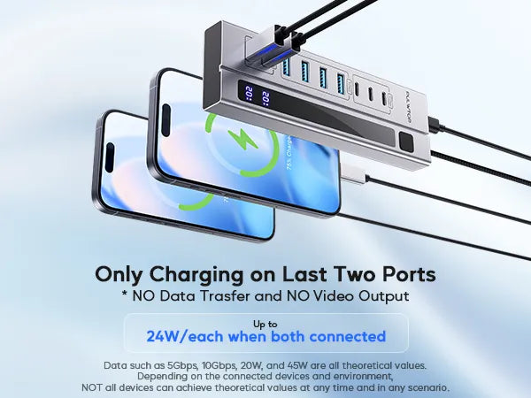 - 65W POWER ADAPTER & PD CHARGING PORTS - The USB C hub powered includes a 65W USB-C power adapter with detachable USB-C to USB-C charging cable, and features with 2 extra USB-C PD charging ports that support pass-through charging up to 20V@3A, 45W (Max) for fast charging your iPad, iPhone 15/Pro/Max, tablets and other Type-C devices. Note: 1). The two charing port ONLY support charing, NO data transfer & video output. 2). Support up to 20W/each when both connected or up to 45W output when either connected, NOT support 45W fast charging for Samsung devices.