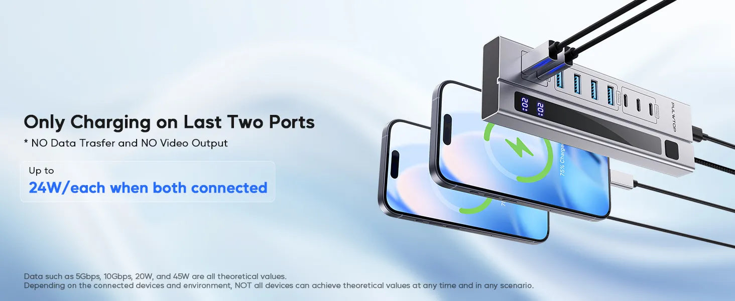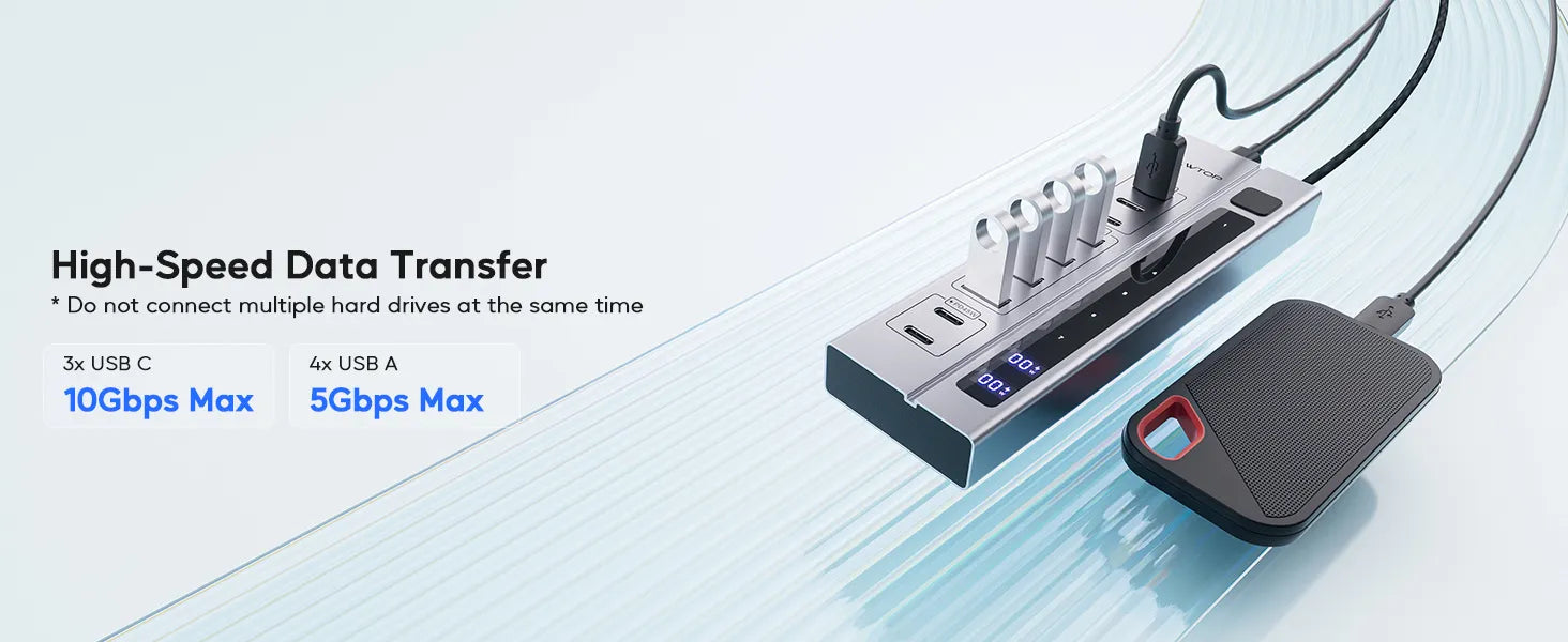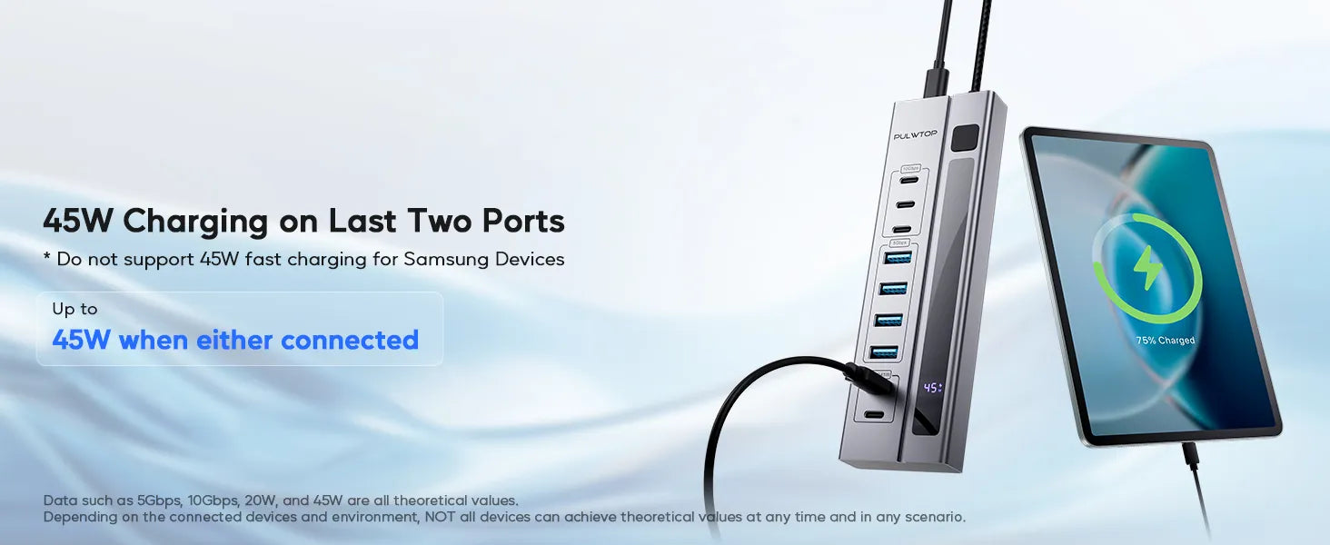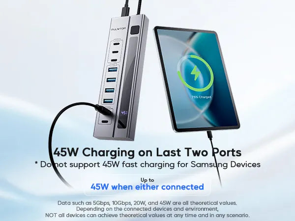 - FASTER SPEED WITH USB 3.2 - PULWTOP USB C 3.2 hub can help you to expands your laptops/tablets that with a limited USB-C port to 7 external extra USB-C/A data ports for keyboard, mouse, printer, hard drivers and other USB-A/C devices. Easy to synchronise data at blazing speeds up to 5Gbps for USB-A and 10 Gbps for USB-C, fast enough to transfer files, audio, and HD video in seconds. Note: All the data ports of this USB C hub adapter DO NOT support the video output and charging.