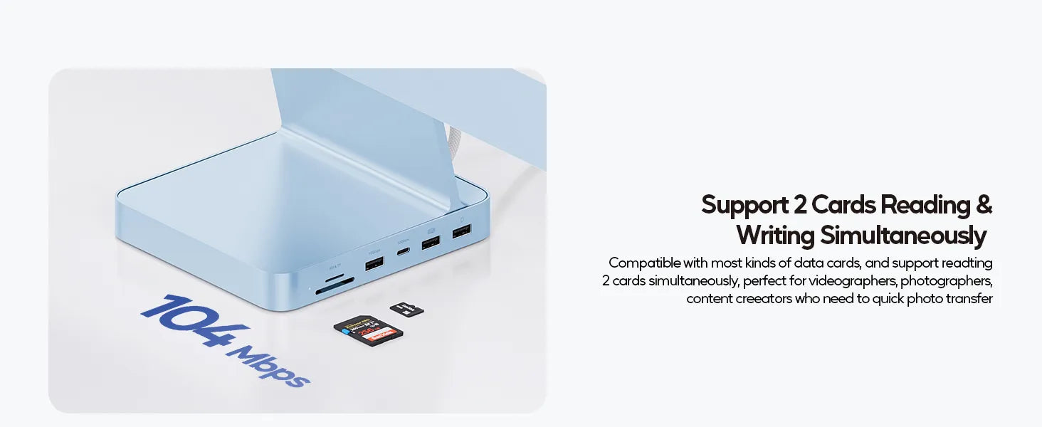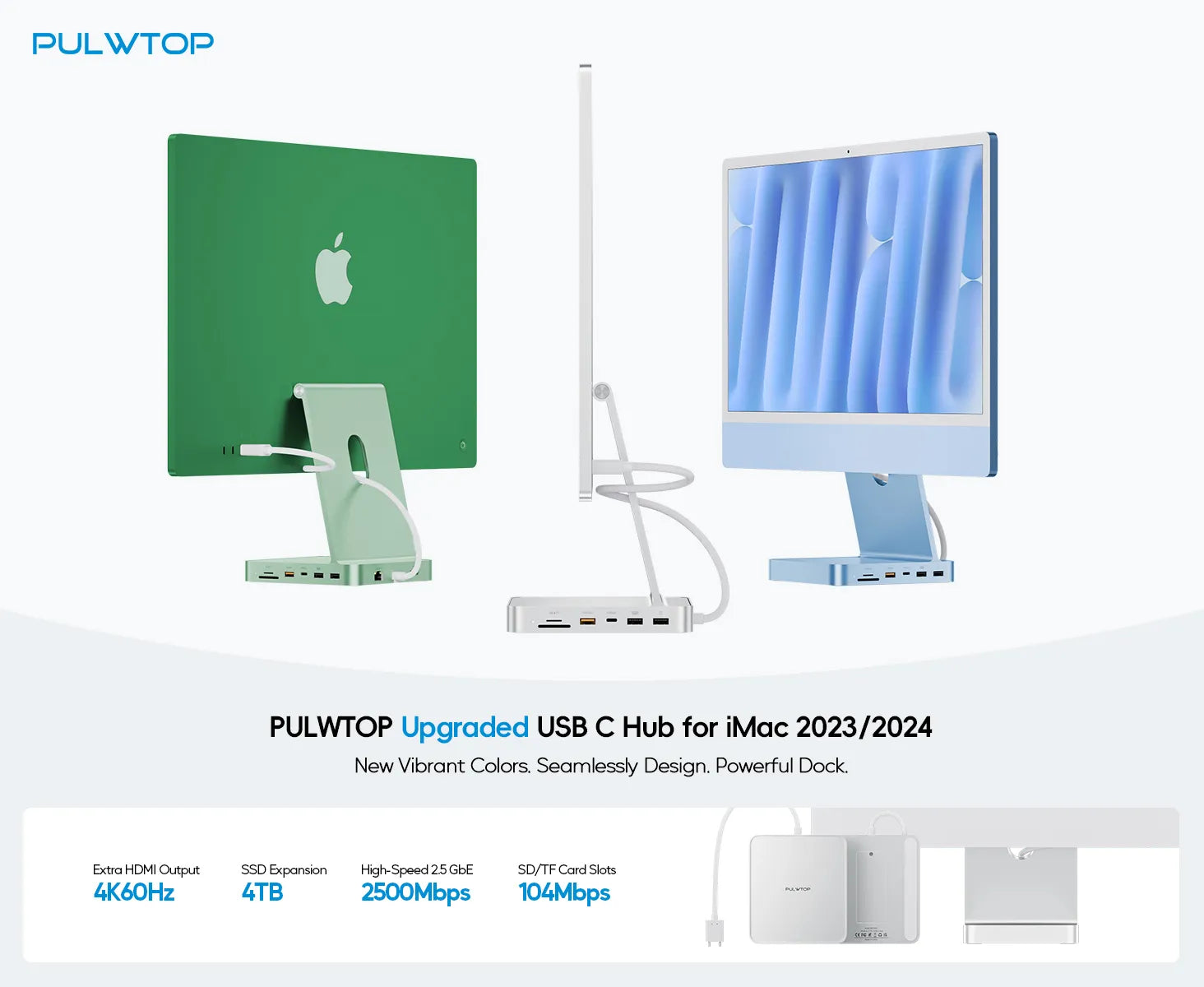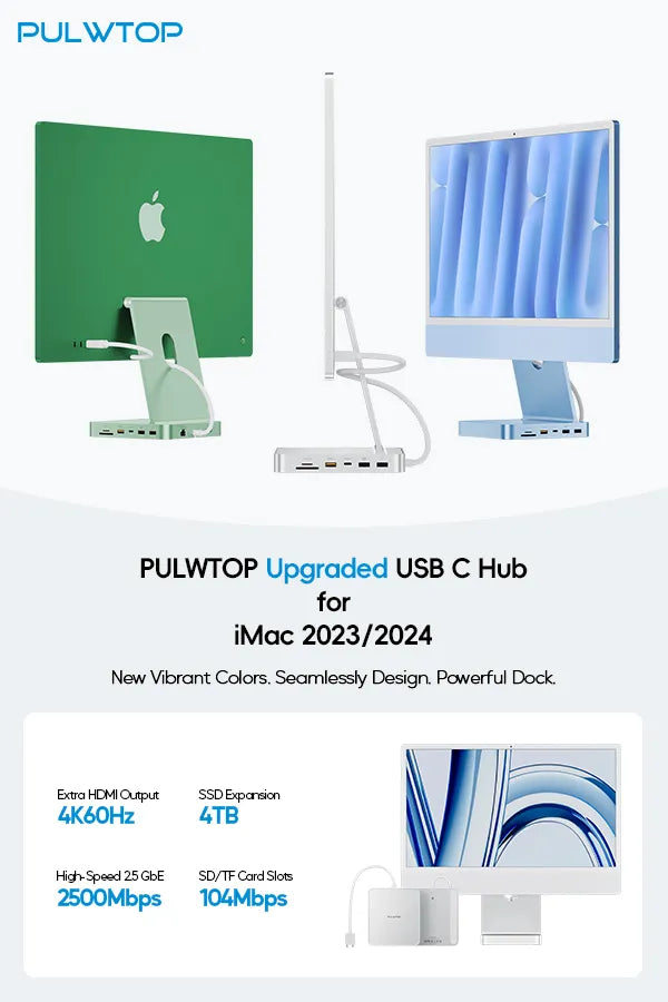 - 11-IN-1 USB C HUB DESIGNED FOR IMAC 24 INCH - Custom-designed for iMac 24 inch 2021/2023/2024, both an iMac dock stand and an iMac hub docking station. As a functional imac 24 inch accessories, this imac hub features a 4K 60Hz HDMI, M.2 SSD enclosure, 2.5G ethernet, USB C 3.2 Gen2 10Gbps, USB A 3.2 Gen2 10Gbps, USB C 2.0 with BC1.2 7.5W charging, 2 x USB A 2.0, SD/TF card reader, 3.5mm audio/mic jack, providing comprehensive connectivity and powerful productivity for your iMac