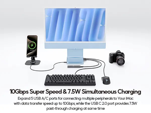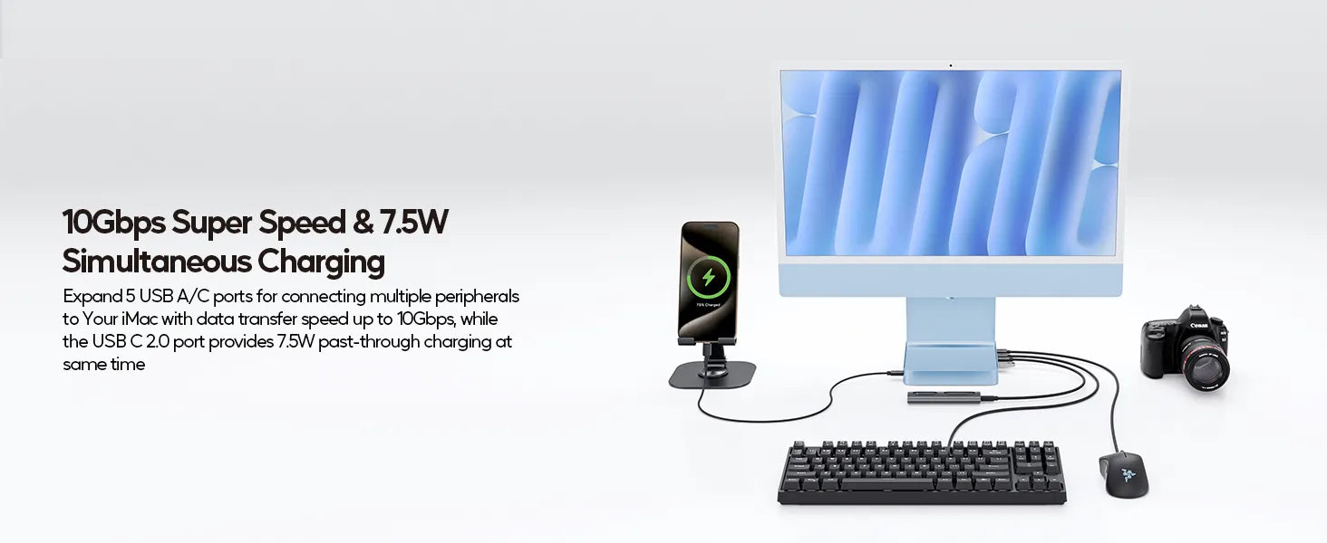- UP TO 10GBPS SUPER SPEED & 7.5W SIMULTANEOUS CHARGING - The imac multiport adapter features with 10Gbps USB-A/C 3.2 Gen2 data ports that support read and write speed up to 1000-1200MB/s, transmiting 1G large files in seconds. Connect your phone or other USB-C device to the 7.5W USB C 2.0 data port to get simultaneous charging. 2 x USB A 2.0 ports, 3.5mm audio/mic jack and SD/Micro SD card readers for seamlessly access to mouse, keyboard, and other essential peripherals at once