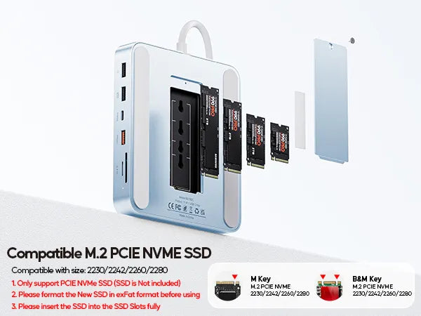 Supports up to 4TB/10Gbps M.2 NVMe PCIe or SATA SSD in 2230/2242/2260/2280 form factors. NOTE: 1) DO NOT support SSDs with a heatsink. 2) Please format your new SSD in exFat format before use