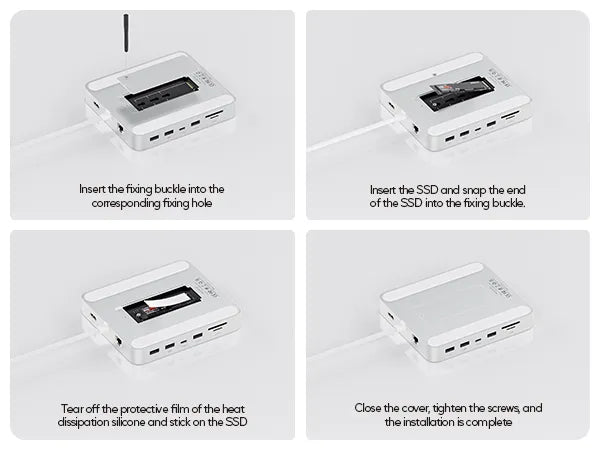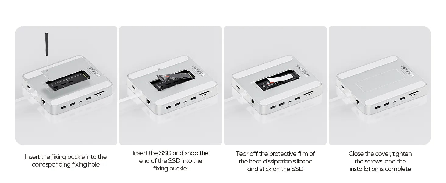 - SUPPORTS M.2 NVME SSD EXPANSION - Equipped with an external hard drive slot at the bottom, this imac m4 docking station supports up to 4TB/10Gbps M.2 NVMe PCIe or SATA SSD in size of 2230/ 2242/ 2260/ 2280 (SSD NOT included). An ideal imac usb dock for the imac 24 inch users who needs additional storage. ★NOTE: 1) DO NOT support SSDs with a heatsink. 2) Please initialize the new SSD because SSDs must be formatted to work with host in order for SSD to mount and show up; 3) Please format your new SSD into "exFat" or "apfs " format