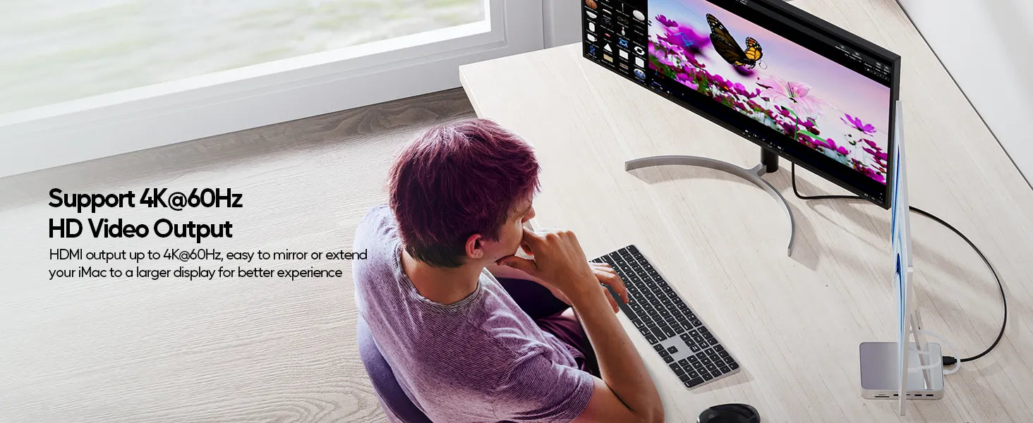 - 4K HDMI HD OUTPUT & 2.5G WIRED ETHERNET - HDMI output up to 4K@60Hz, the imac usb hub with HDMI is easy to mirror or extend your imac 24 inch M1 M3 M4 to a larger HDTV, monitor or projector to improve your work effiency and elevate your movie or gaming experience. A wired gigabit ethernet port up to 2.5 Gbps enables fast, steady network connection for full HD movies, 3D video games, online meetings, entertainment, etc. ★NOTE: The imac hub MUST connect to one of iMac's Thunderbolt ports to extend external display
