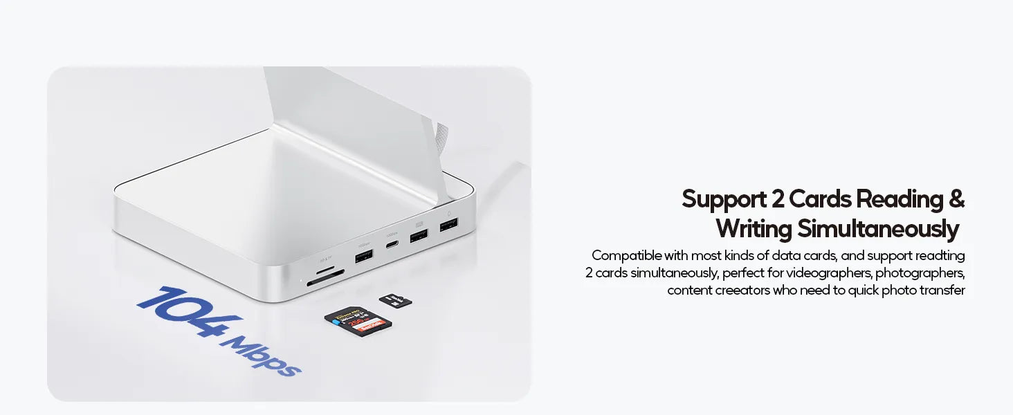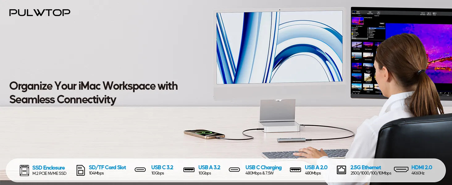 - 11-IN-1 USB C HUB DESIGNED FOR IMAC 24 INCH - Custom-designed for iMac 24 inch 2021/2023/2024, both an iMac dock stand and an iMac hub docking station. As a functional imac 24 inch accessories, this imac hub features a 4K 60Hz HDMI, M.2 SSD enclosure, 2.5G ethernet, USB C 3.2 Gen2 10Gbps, USB A 3.2 Gen2 10Gbps, USB C 2.0 with BC1.2 7.5W charging, 2 x USB A 2.0, SD/TF card reader, 3.5mm audio/mic jack, providing comprehensive connectivity and powerful productivity for your iMac