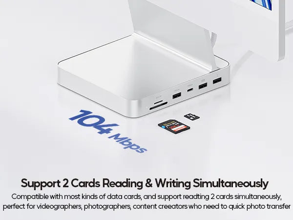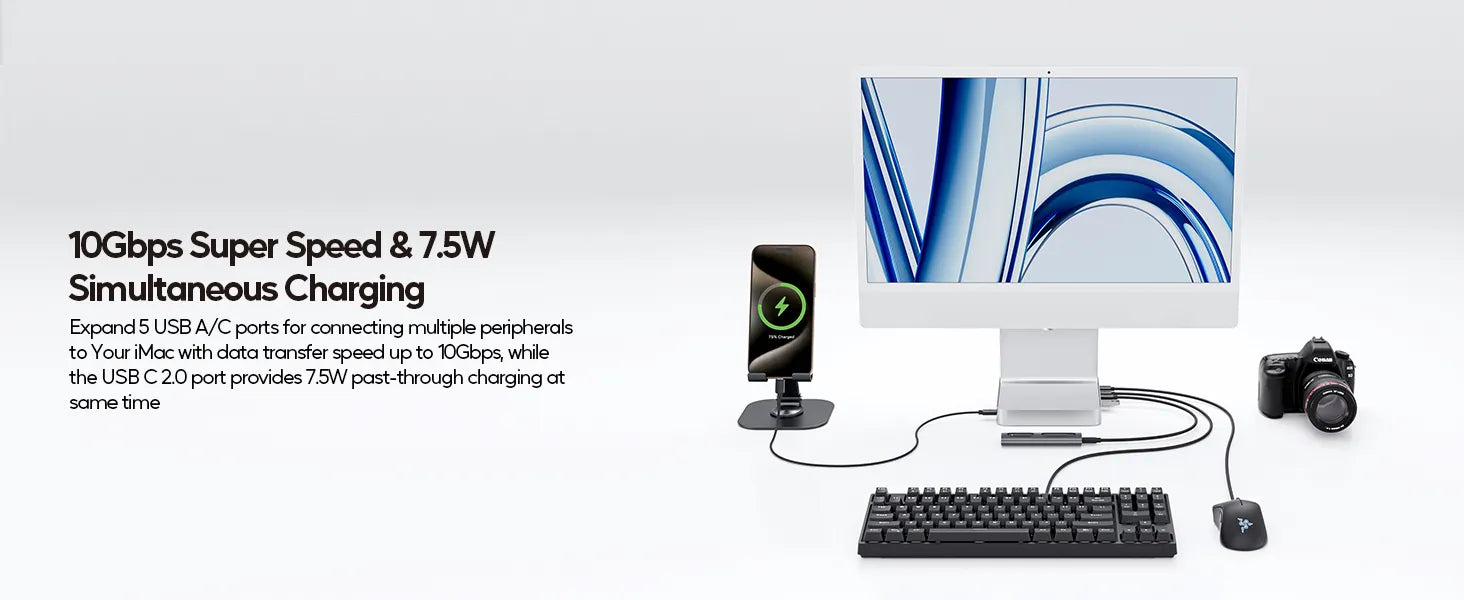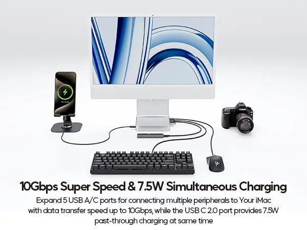 - UP TO 10GBPS SUPER SPEED & 7.5W SIMULTANEOUS CHARGING - The imac multiport adapter features with 10Gbps USB-A/C 3.2 Gen2 data ports that support read and write speed up to 1000-1200MB/s, transmiting 1G large files in seconds. Connect your phone or other USB-C device to the 7.5W USB C 2.0 data port to get simultaneous charging. 2 x USB A 2.0 ports, 3.5mm audio/mic jack and SD/Micro SD card readers for seamlessly access to mouse, keyboard, and other essential peripherals at once