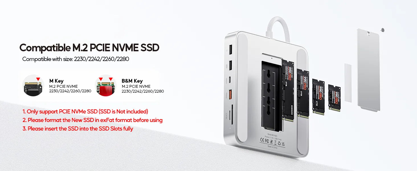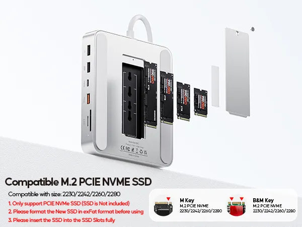 - SUPPORTS M.2 NVME SSD EXPANSION - Equipped with an external hard drive slot at the bottom, this imac m4 docking station supports up to 4TB/10Gbps M.2 NVMe PCIe or SATA SSD in size of 2230/ 2242/ 2260/ 2280 (SSD NOT included). An ideal imac usb dock for the imac 24 inch users who needs additional storage. ★NOTE: 1) DO NOT support SSDs with a heatsink. 2) Please initialize the new SSD because SSDs must be formatted to work with host in order for SSD to mount and show up; 3) Please format your new SSD into "exFat" or "apfs " format
