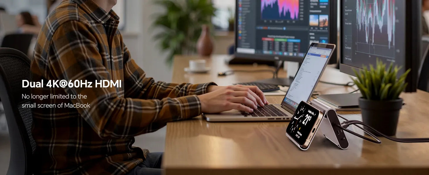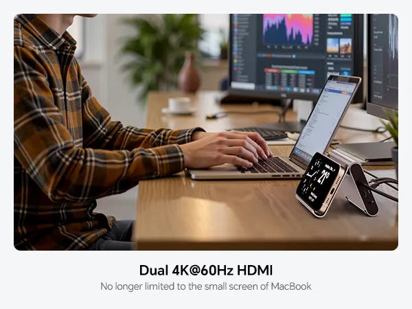 - 【4K HDMI HD Output】: The macbook air docking station dual monitor output up to 2 *4K@60Hz, the Mac Dock can perfectly mirror or extend your screen to HDTV, monitor or projector, suitable for full HD movies, 3D video Games, office meetings and entertainment. Surf the web, watch video clips, transfer data, all in one. Bringing you vivid video synchronization.