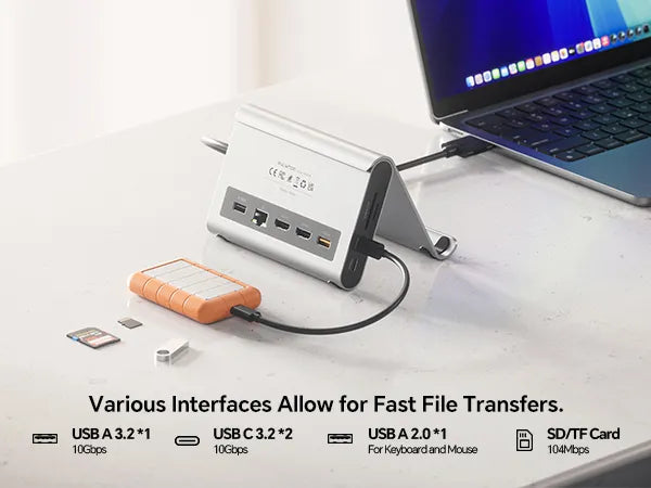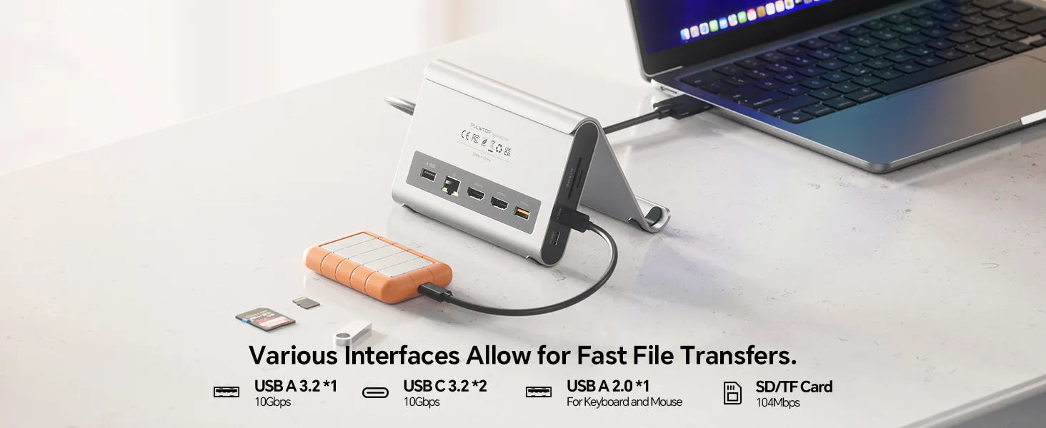 - 【Super Speed Data Transfer Dock】: This docking station for macbook air has 2 USB C 10Gbps port (Not Support video and charging) , 1 *USB A 10Gbps 5Gbps and 1 *USB A 2.0 to transfer files. The USB A 2.0 Port allows you to connect mouse/keyboard without lag. It improves your work efficiency. The USB C docking station With Max PD 100W Charge Port and RJ45 Wired Gigabit Ethernet (10/100/1000Mbps).