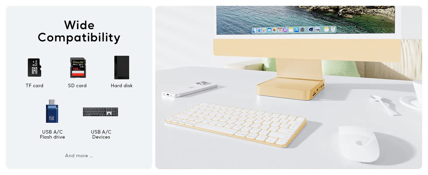 - Compatibility: The usb-c multi-port hub is compatible with iMac M1 with Type C port (need to support data transmission function), the embedded design only supports iMac 24-inch 2021 computers. In addition, the usb-c docking station also supports other USB C Laptops with port support data transfer function.