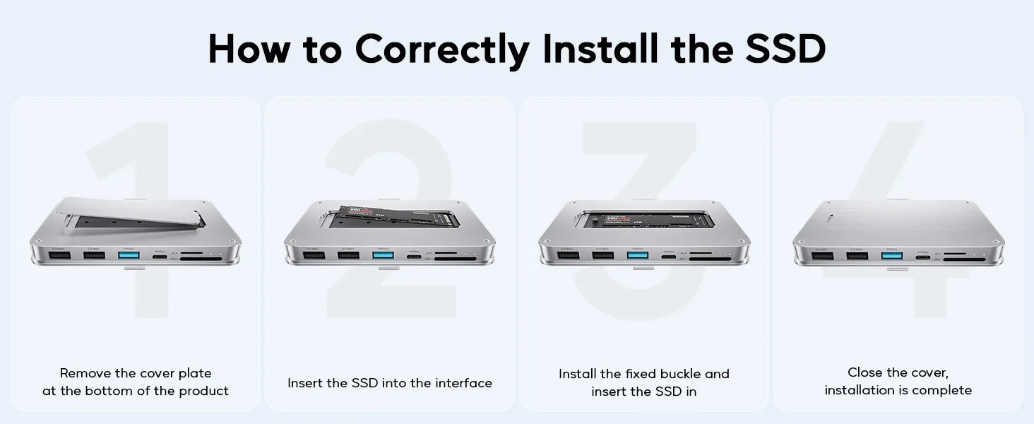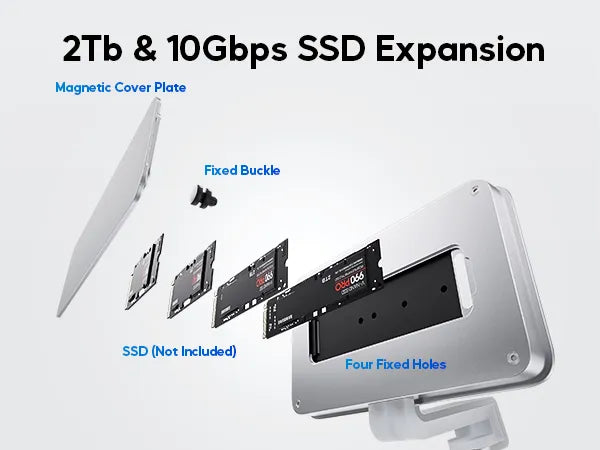 - 【Note】: ①The ports of the iMac usb hub for 2021/2023/2024 iMac do not support video output and charging. It is primarily designed for data transmission and support M.2 SSD.② The non-slip pad at the bottom of the iMac hub and the mobile bottom plate allows users to install SSD. If using too thick thermal conductive silicone on the M.2 SSD will cause the bottom to unable to close normally.