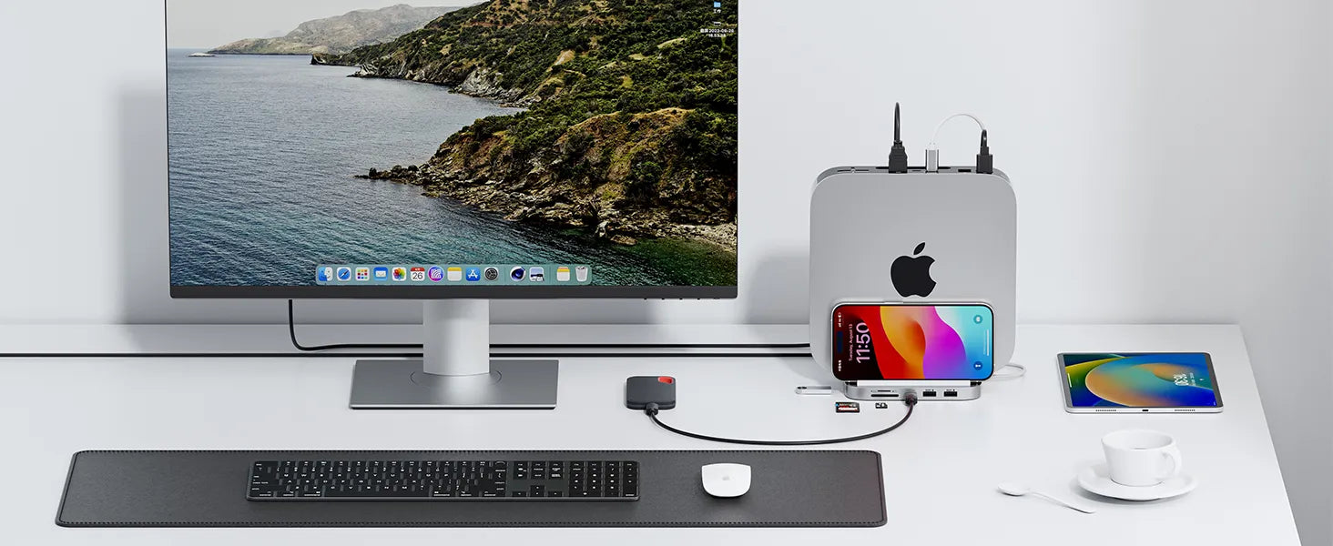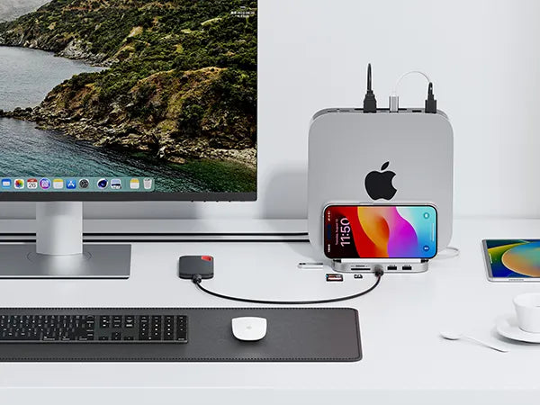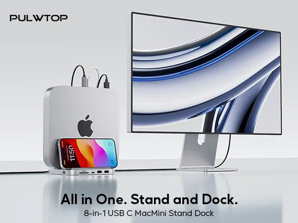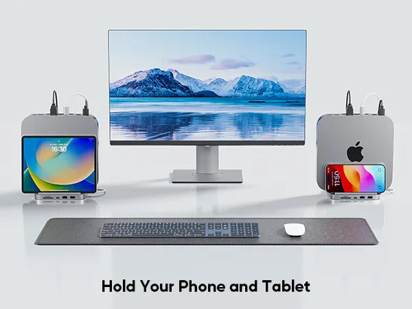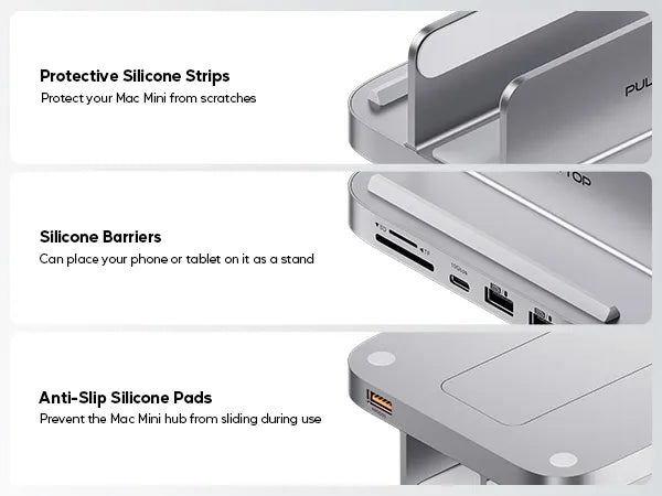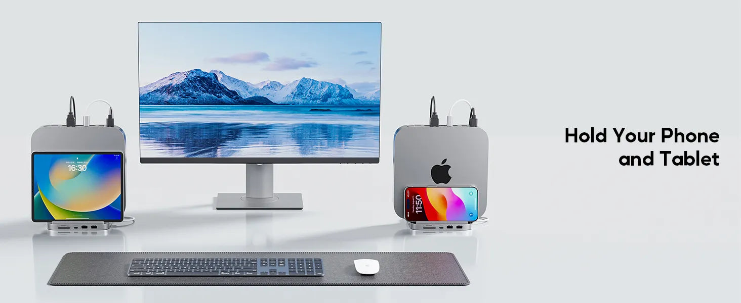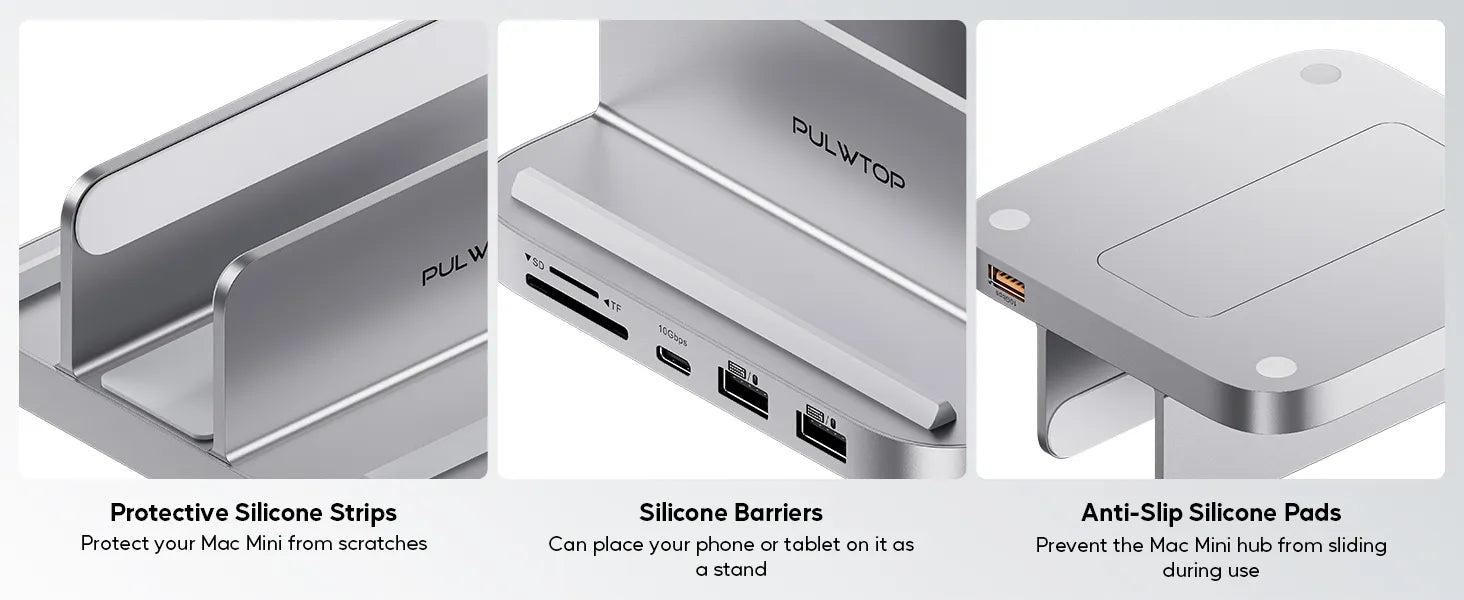 - VERTICAL MAC MINI HUB STAND - Both a Mac Mini stand and USB-C Mac Mini hub, vertical stand design allows you to place your Mac Mini horizontally or vertically on the desk, achieving good heat dissipation and keeping your desktop tidy. Silicone barrier strips on both sides also make it as good iPad stands, phone stands.