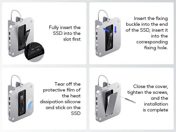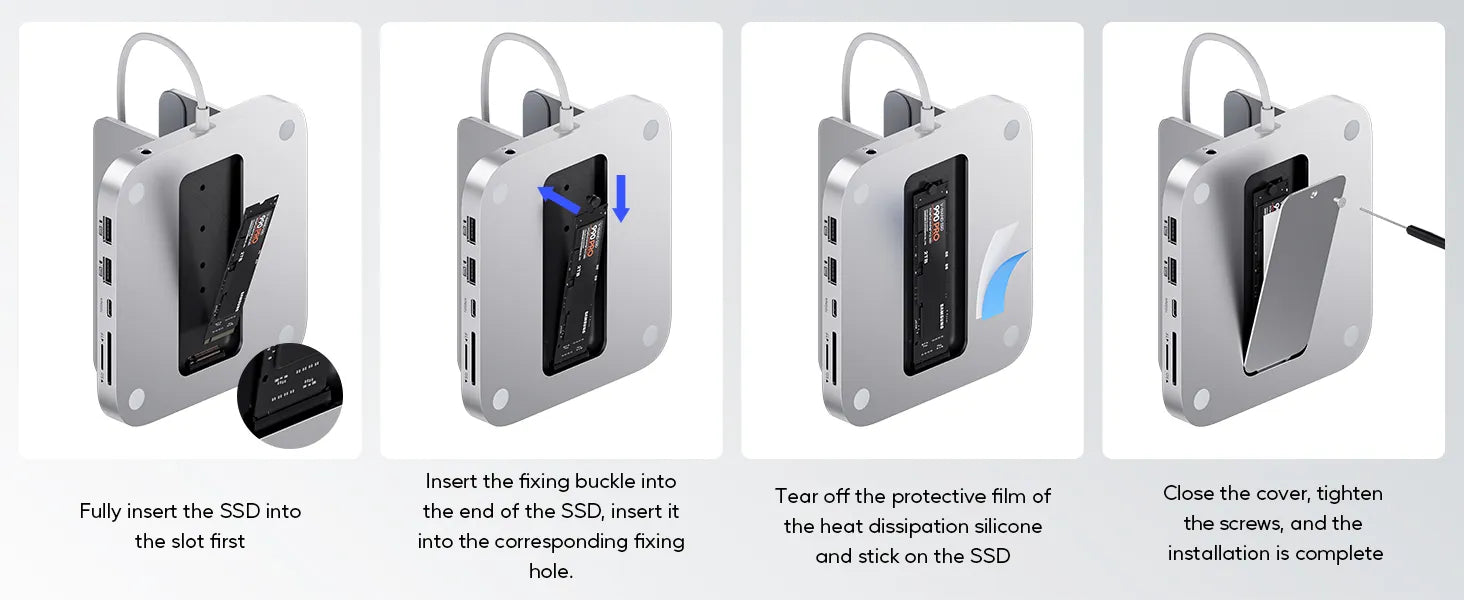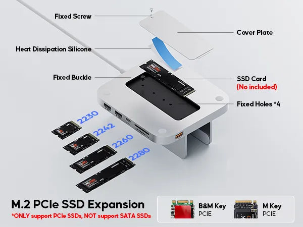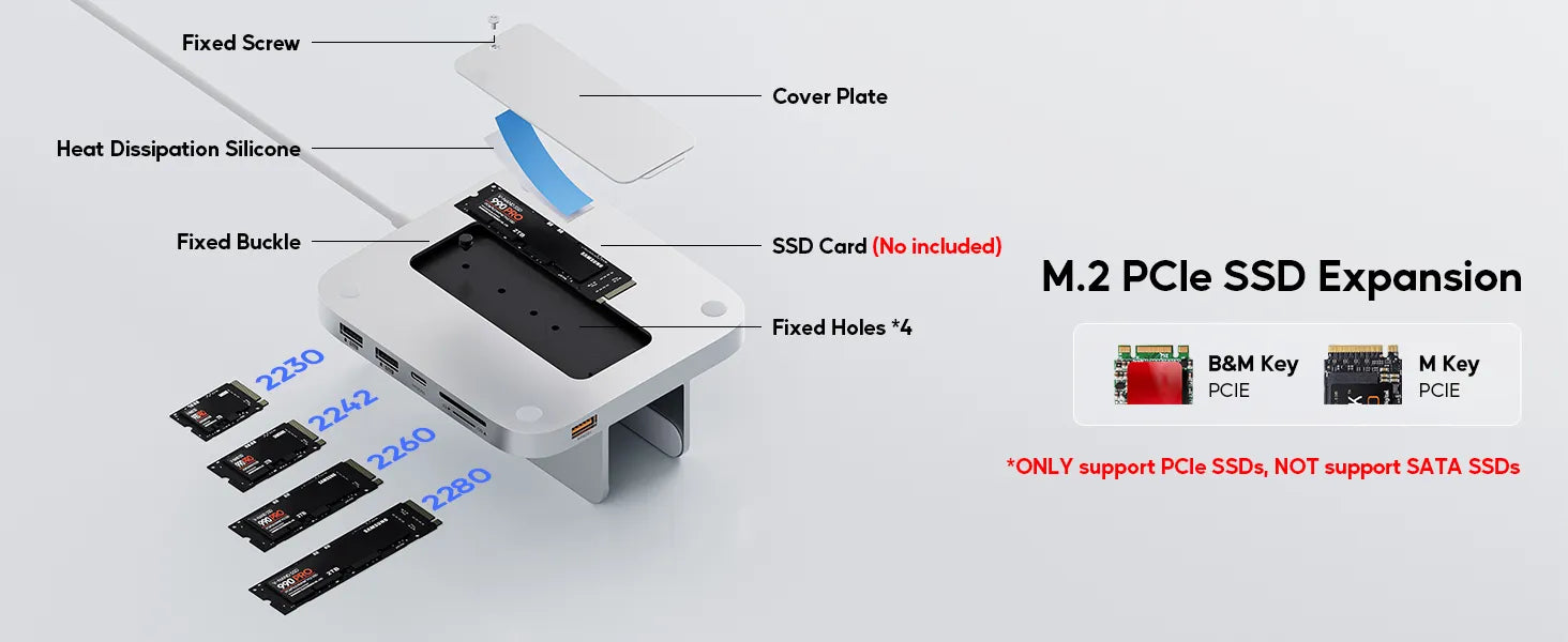 - 2TB M.2 SSD ENCLOSURE - Our Mac Mini Hub supports up to 10Gbps M.2 PCIe NVMe SSD. The SSD enclosure of the Mac Mini dock is compatible with NVMe protocol (B+M Key/ M Key) SSD external hard drives in sizes of 2230/2242/2260/2280 and up to 2TB capacity expansion. *NOTE: 1). SSD NOT Included. 2). DOES NOT support SATA SSDs