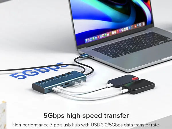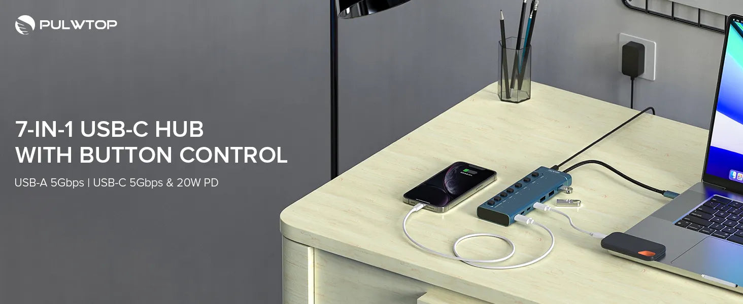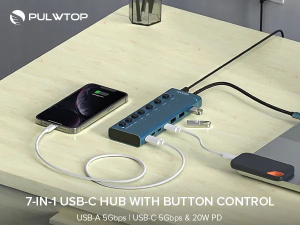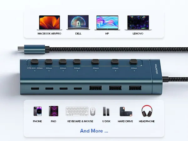 PULWTOP 7-in-1 Powered USB Hub - 3x USBA 3.0 Data Ports & 4x USB C Data Ports Fits Laptops, MacBook Pro